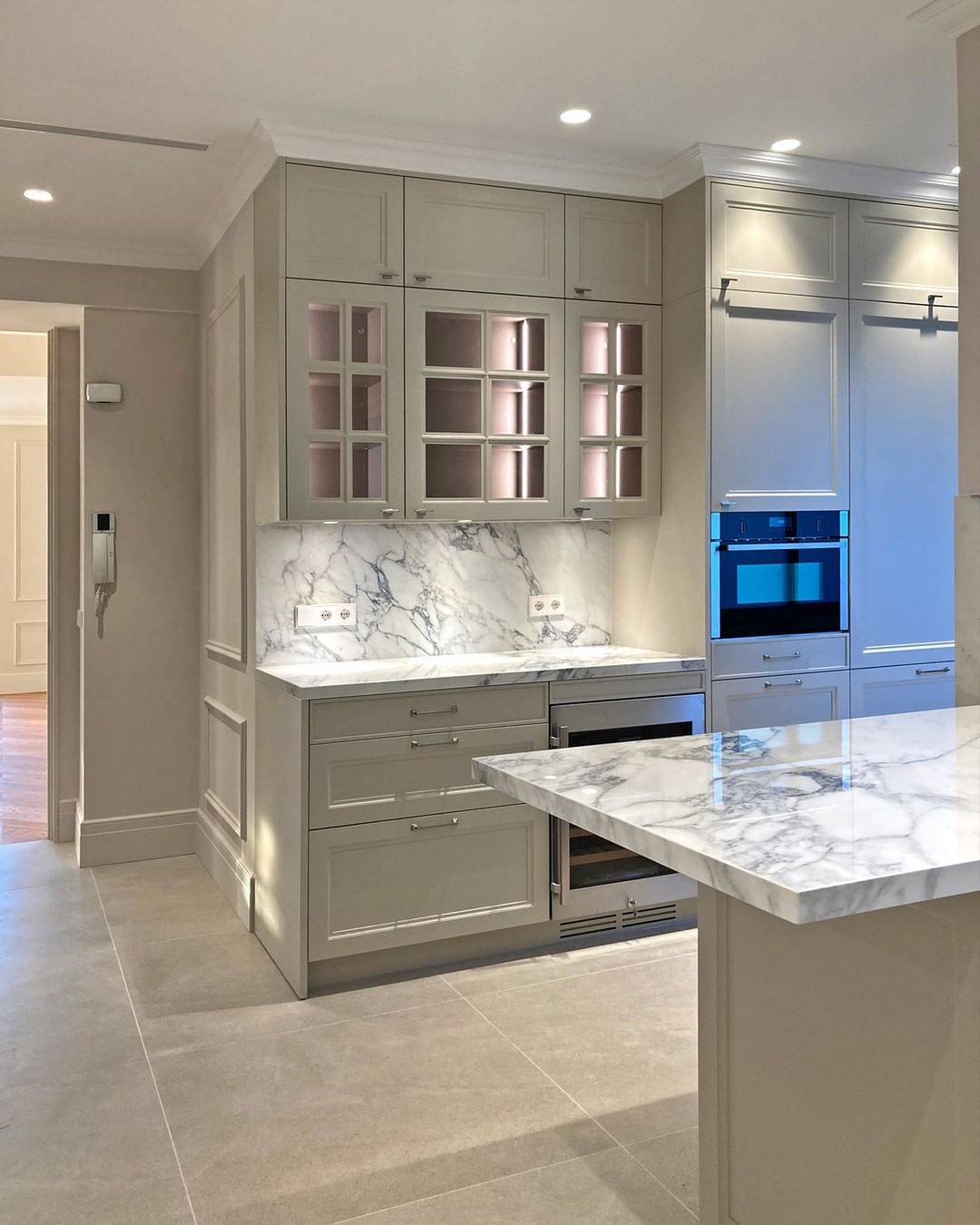 Deslumbrados por las encimeras utilizadas en la zona de trabajo y la isla central, esta cocina construida sobre los tonos neutros y las líneas rectas presenta detalles neoclásicos en mobiliario y revestimientos, creando una composición elegante y atractiva.