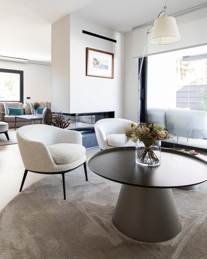 Las formas redondeadas y las texturas suaves presentes en los elementos de este salón crean una atmósfera propicia para el descanso y la relajación. Los tonos neutros, por su parte, terminan de definir un espacio con un estilo elegante y contemporáneo.