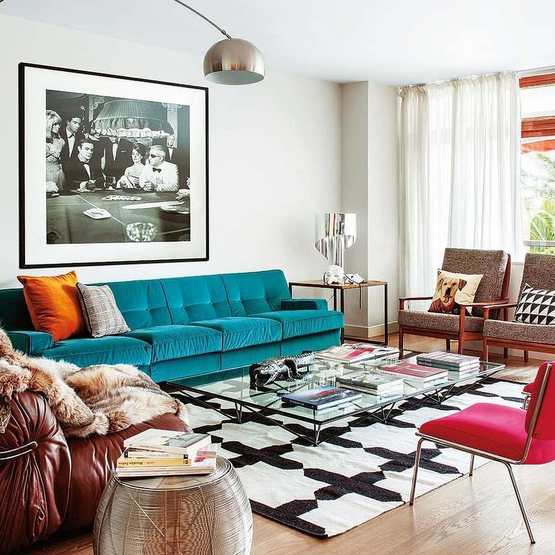 Este salón con un marcado estilo ecléctico tiene un protagonista que destaca sobre el resto de elementos:  gran sofá de terciopelo en azul turquesa que rompe con los tonos cálidos que dominan la composición. El resto de elementos también brillan con luz propia pero sin desentonar entre ellos, algo que tenemos que tener en cuenta cuando configuramos un salón de este tipo.