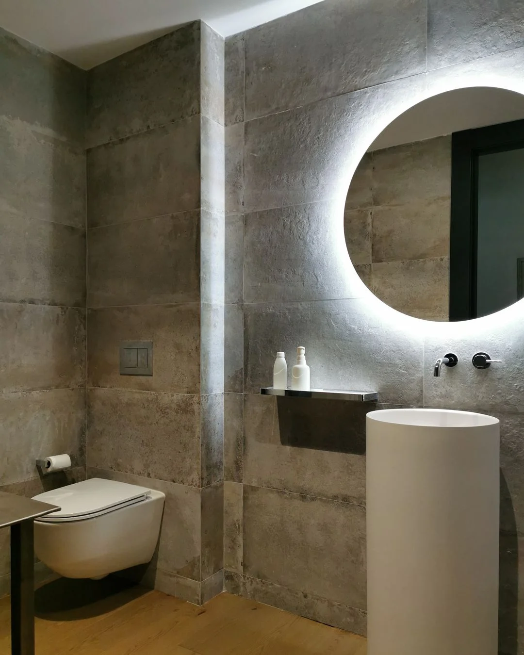 Un marcado estilo contemporáneo con tendencia al diseño industrial vehicula esta composición en la que los materiales, el lavabo principal y el espejo retroiluminado se encargan de aportar la originalidad y el atractivo visual. La puerta, el toallero y la grifería ponen la guinda a un baño que te sorprende de inmediato.