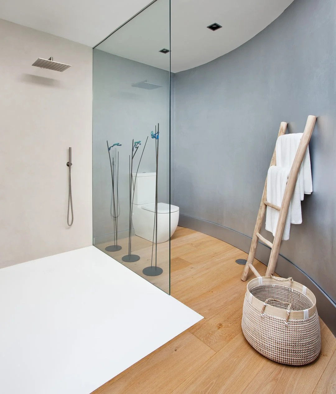 Por último, los detalles como la escalera de madera y el suelo ayudan a lograr un estilo rústico-contemporáneo que se convierte en la seña de identidad de este baño.