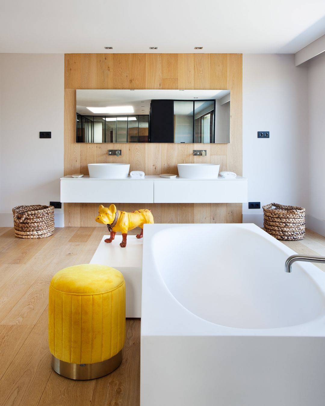 La bañera exenta de diseño a doble altura es el punto central de este baño selecto en el que todas las piezas dialogan entre sí a la perfección.
