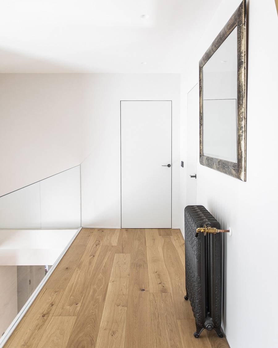 Por último, las puertas correderas nos permiten optimizar el espacio disponible de la estancia e incluso fusionarla con otra adyacente, ya que se vuelve ‘invisible’. En este caso se ha confeccionado en una madera clara muy atractiva que rompe con los tonos claros de la construcción.