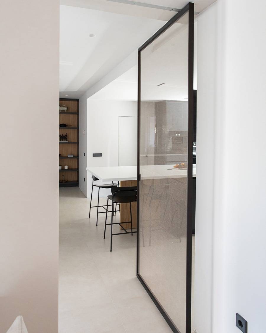 Con un diseño contemporáneo y el objetivo de aportar más luz a las estancias, las puertas de cristal son una solución idónea para cocinas o espacios en los que queremos que entre mucha luz. En este caso, la puerta cuenta con un poco de opacidad (para una mayor privacidad) y un perfil minimalista en negro que enmarca la cocina que protege.