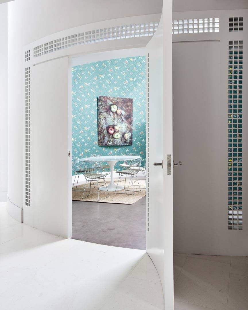 Es muy importante que nuestras puertas se adapten a las formas de la construcción. Es por ello que en este baño se ha instalado una puerta curva en tonos blancos que nos permite la continuidad en el diseño el proyecto. En este caso contamos con la posibilidad de agrandar la apertura gracias a que se ha instalado una puerta doble.