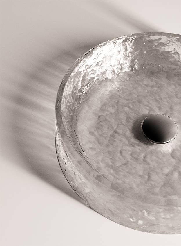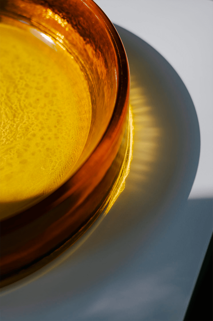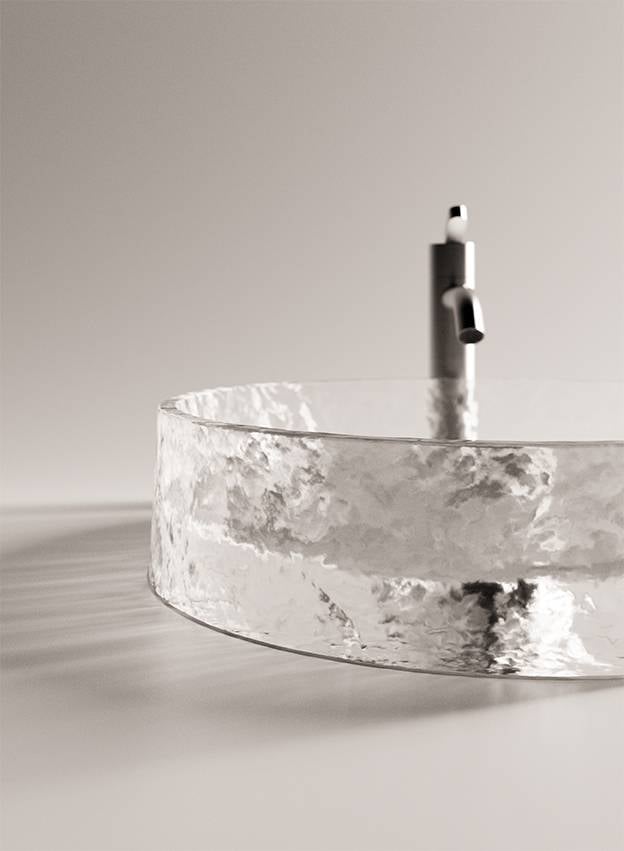 En su colección Massicci, el vidrio adquiere densidad y presencia. Se presenta en tonos transparentes o ámbar, y establece un diálogo armónico con la piedra, la madera o el metal. No se oculta, resplandece. Lejos de limitarse a reflejar, aporta calidez, suaviza los contornos y construye una atmósfera de equilibrio y serenidad.