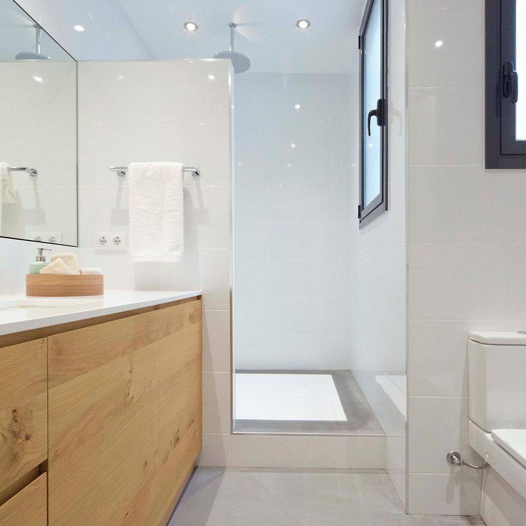 La madera, presente tanto en el mueble principal como en la bandeja para accesorios, es la protagonista en esta propuesta que destaca por la sencillez de sus elementos y el aprovechamiento del espacio. Su combinación con los tonos blancos que vemos en encimera y revestimientos generan un acabado atractivo y minimalista propios del estilo nórdico.⁣🏠 @lobohomes_barcelona