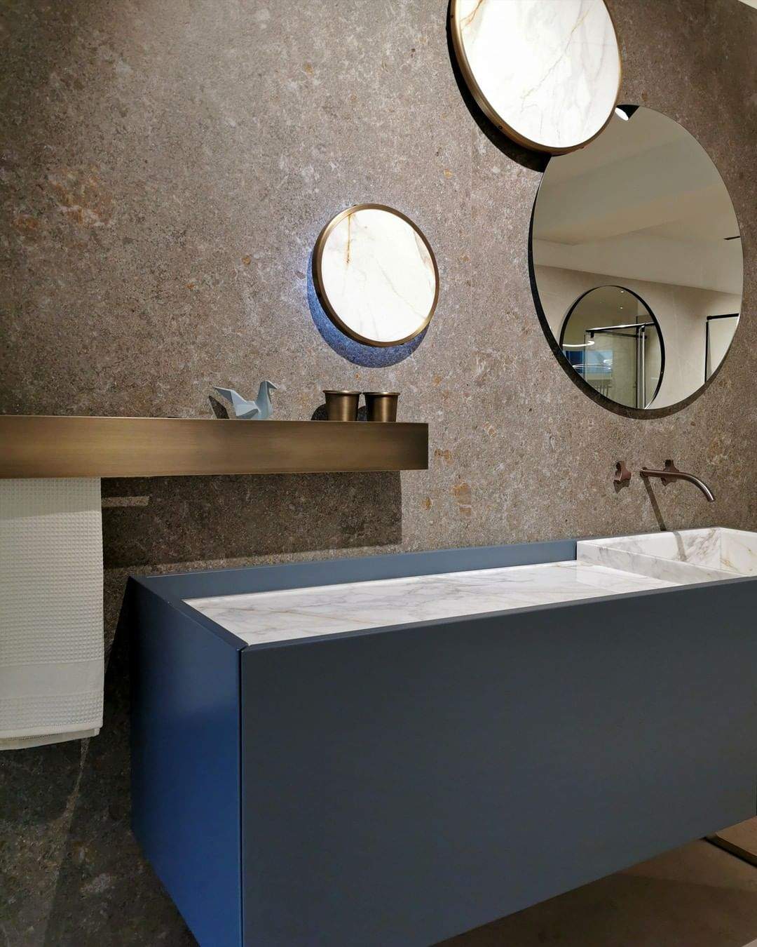 Un marcado estilo industrial es la propuesta diferencial de este baño de diseño que incorpora elementos más contemporáneos como el mueble principal o las piezas decorativas circulares.
