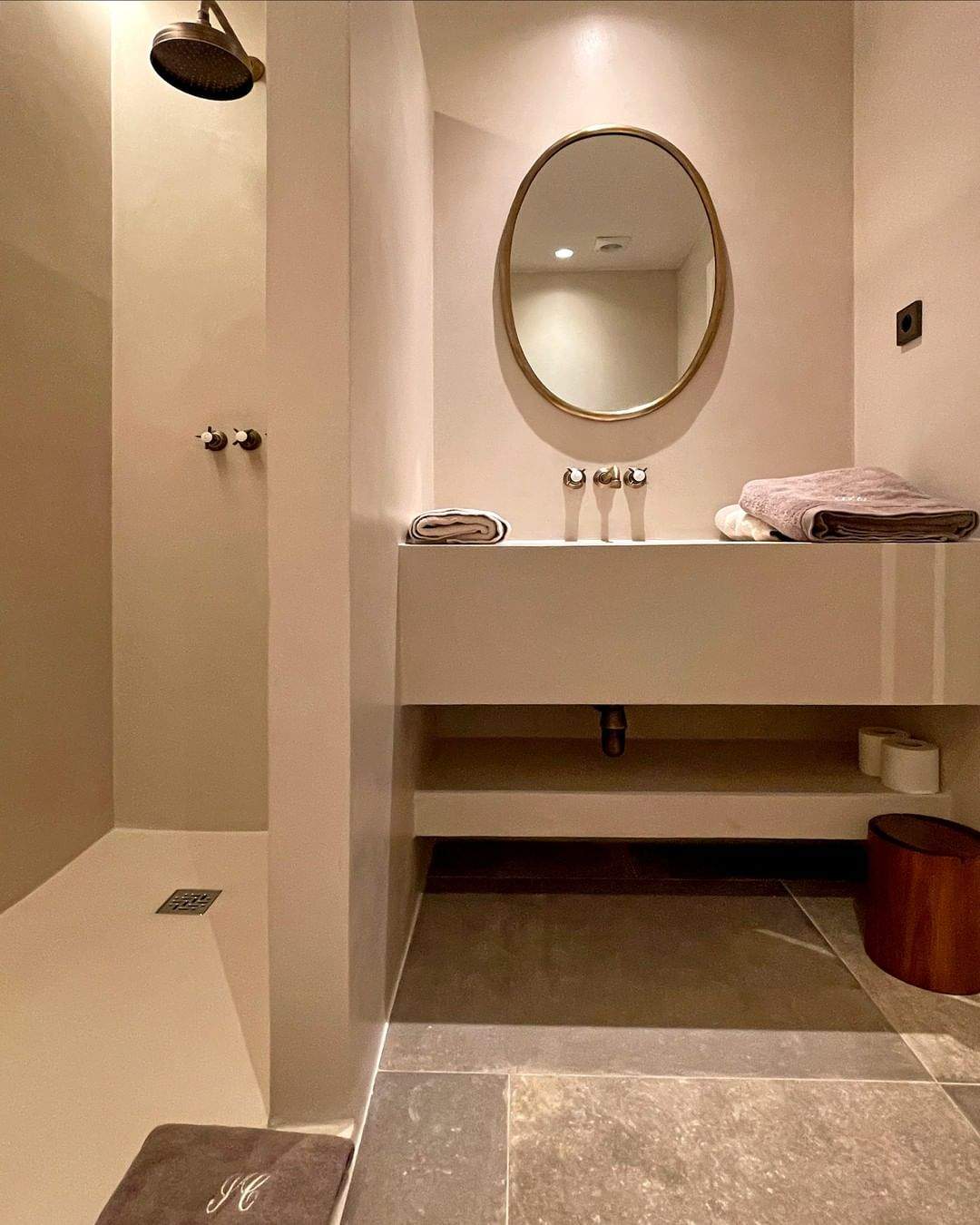 La grifería de diseño presente en lavabo y ducha se lleva todas las miradas en este baño exclusivo gracias a su estilo clásico, sus tonos vintage y sus formas sugerentes. Además, consigue un diálogo especial con el material utilizado en el suelo, generando una atmósfera rústica muy original.
