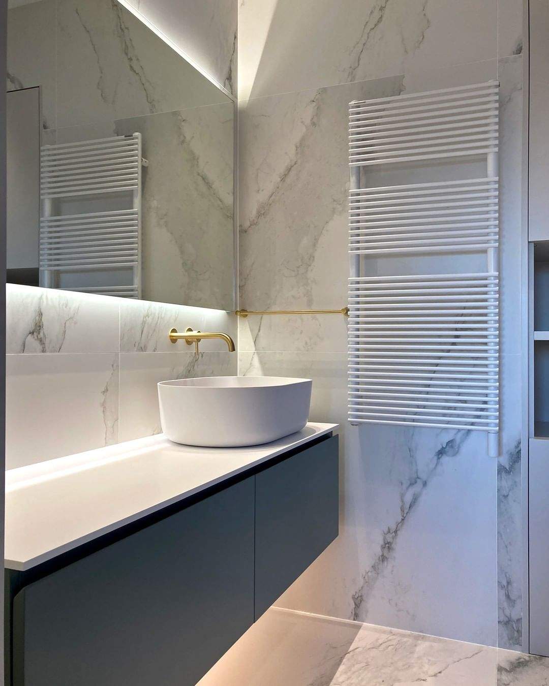 Envuelto en un porcelánico efecto mármol Calacatta blanco, este baño de diseño destaca por su iluminación indirecta (muy interesante en espacios de este tipo); por las formas sugerentes de lavabo y grifería; y por los tonos y líneas del mueble principal.