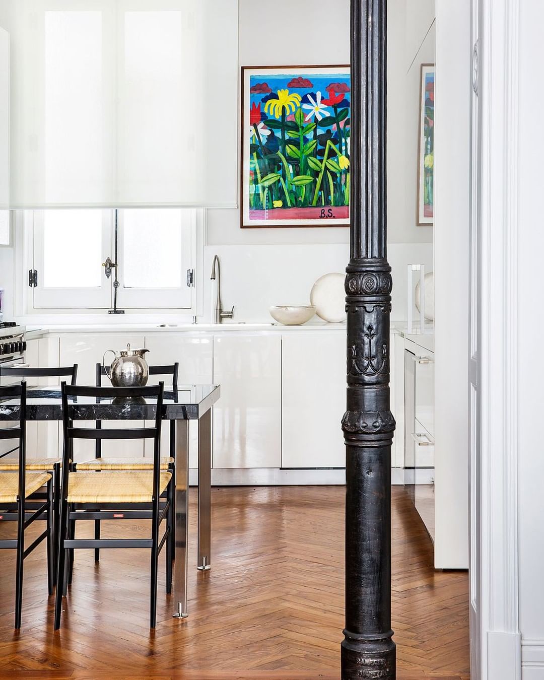 El mobiliario de diseño minimalista en tonos blancos y en acabado brillante contrasta a la perfección con la columna vista en negro y el suelo de madera, mucho más clásicos. Las sillas y la mesa principal aportan el toque original sin renunciar a la sobriedad característica de esta cocina.