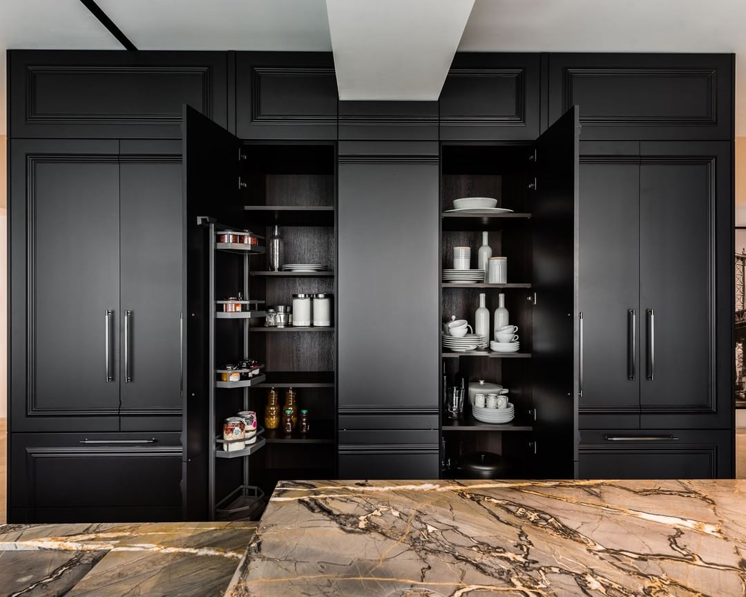 La isla de cuarcita satinada se complementa a la perfección con el negro mate presente en el mobiliario de esta cocina clásica-contemporánea. Los detalles en dorado que encontramos en grifería y cocina auxiliar terminan de crear un espacio elegante y exclusivo.