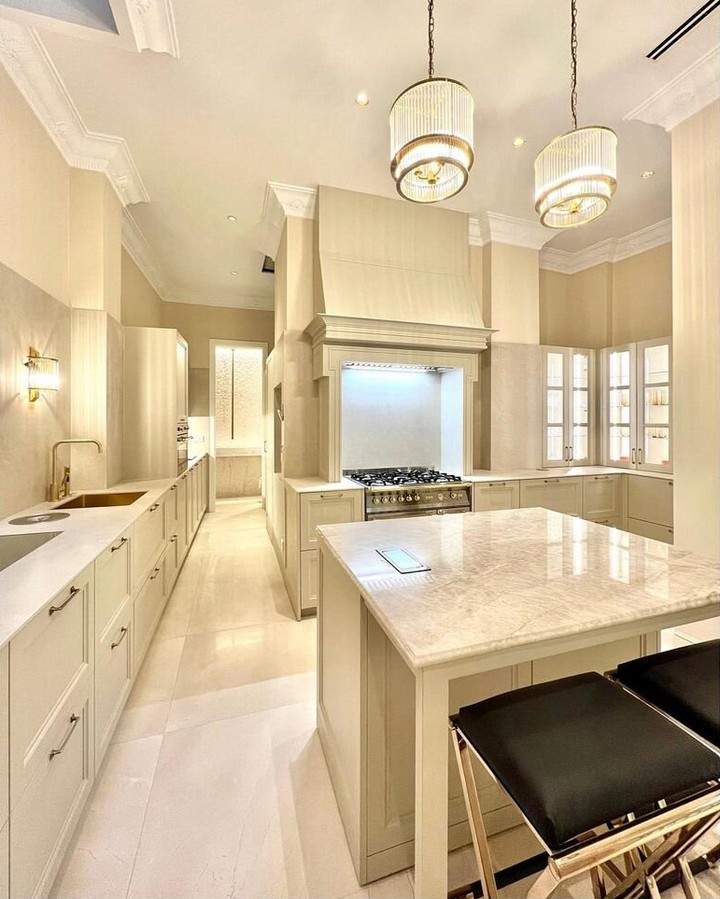 Atractivo, exclusividad y diseño se unen en esta cocina neoclásica que cuenta con una amplia zona de trabajo, una isla central de mármol y una gran cantidad de almacenamiento oculto. Sus tonos neutros mezclados con piedra natural generan una sensación de bienestar muy demandada.