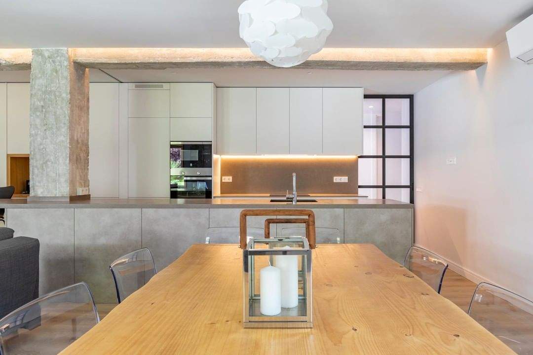 Mimetizándose por completo con el resto del espacio, esta cocina abierta de estilo contemporáneo destaca por su mobiliario minimalista, la iluminación indirecta y una gran encimera que permite colocar una barra de desayuno en uno de los extremos.