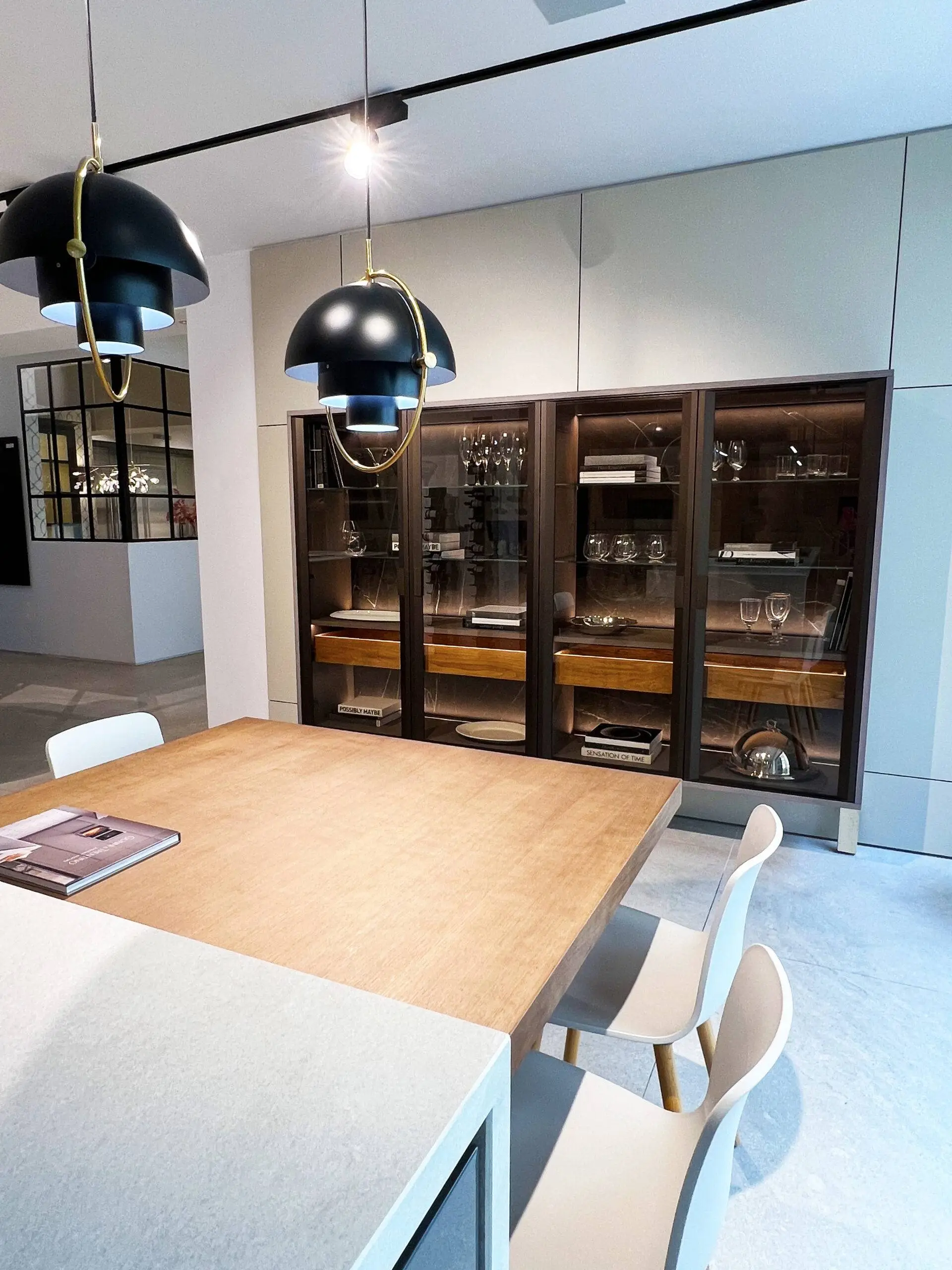 En relación con el almacenamiento, es una característica fundamental para mantener la zona organizada, segura y eficiente para la preparación de cualquier alimento, el uso de estantes, cajones y armarios, genera un ahorro de espacio y mejora de la durabilidad de los utensilios de la cocina y de los mismos alimentos. Por lo que, en esta zona creada por Gunni&Trentino, uno de los elementos a destacar es el módulo “desayunador” con puertas plegables, que cuenta con una encimera en piedra natural con acabado Perla Venatta pulido y en su interior posee baldas en laca mate e iluminación led que se activa al abrir las puertas. De igual modo, se han diseñado unos cuberteros 100% personalizables y exclusivos, que los hace un elemento diferenciador en la cocina, ya que tiene doble funcionalidad, pueden emplearse como bandeja extraíble que sirve como apoyo para servir la mesa, con un acabado porcelánico que también se puede ver en la trasera de la vitrina.