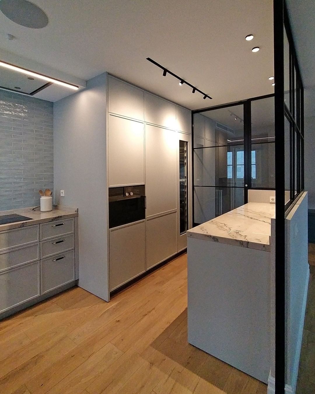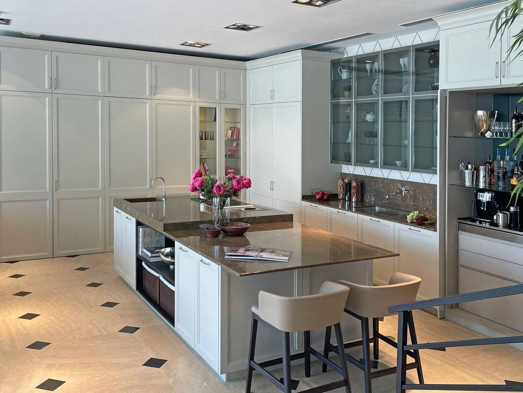 El lujo y la elegancia son las señas de identidad de una cocina en la que destacamos los materiales de encimeras, suelo e isla; su gran espacio y comodidad gracias al mobiliario de almacenaje; y una gama cromática que unifica y da sobriedad a la composición.