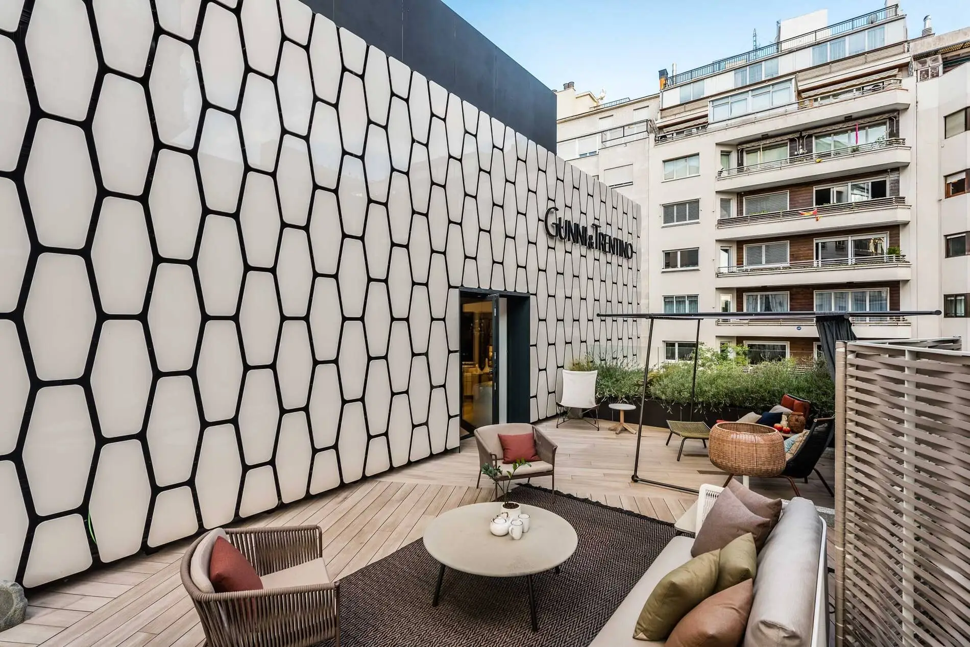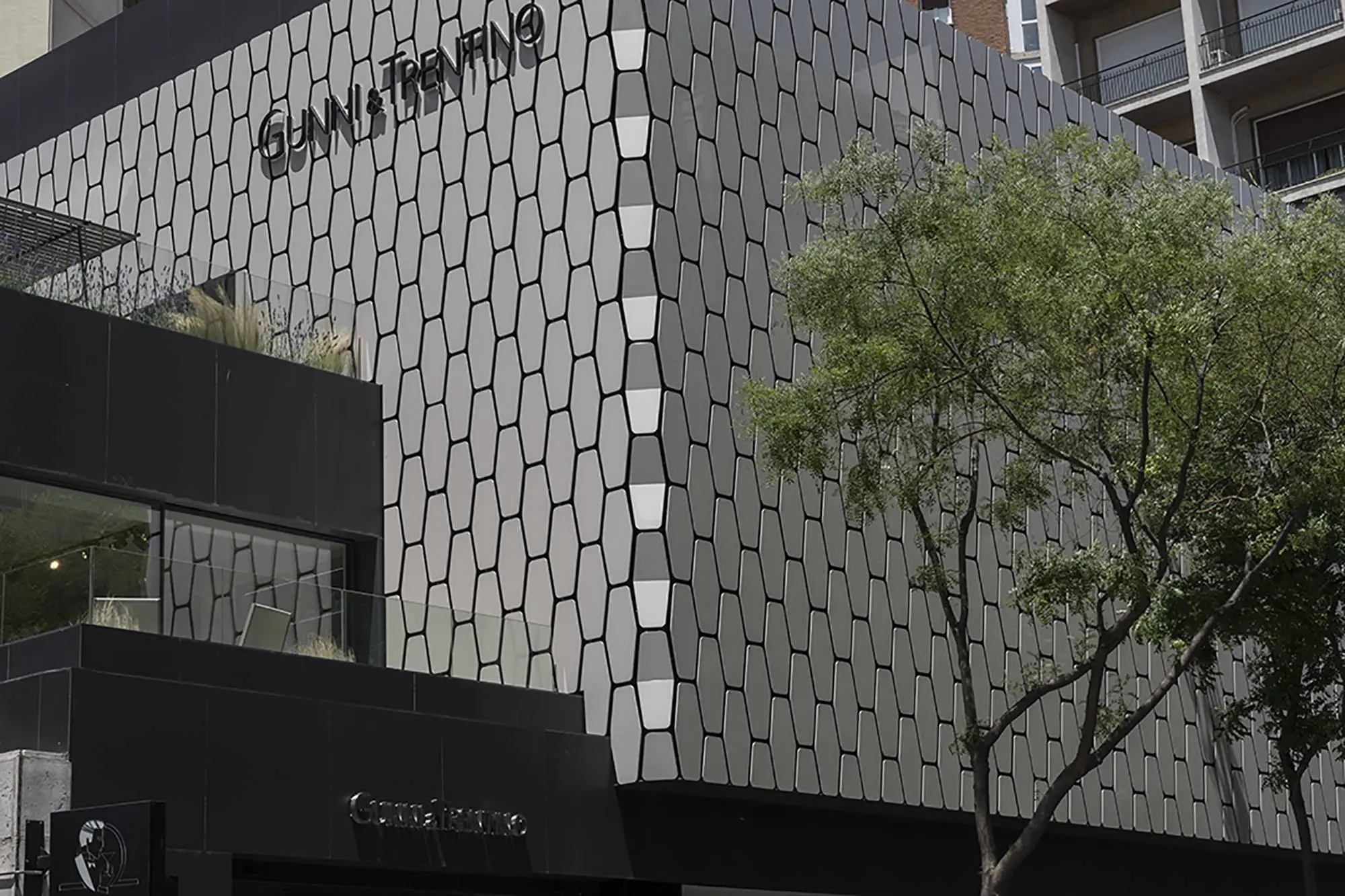En la fachada puedes descubrir un revestimiento exclusivo conocido como «Escama», realizada en porcelánico Dekton de Cosentino, con el que se ha trabajado en este diseño único. ¡Adéntrate en el mundo de Gunni & Trentino desde la planta cero y descubre todas nuestras áreas de trabajo!