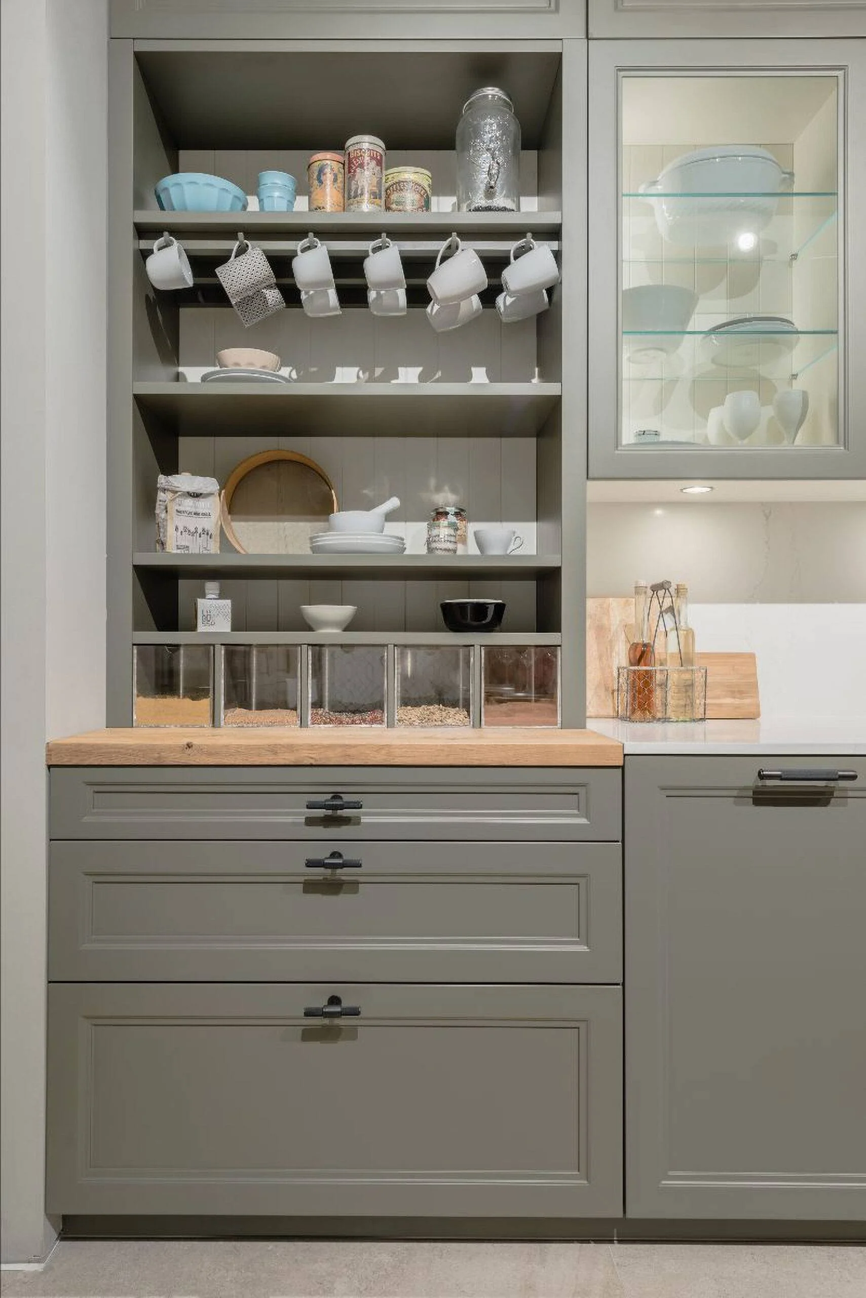 Por otro lado, destacamos nuestra cocina modelo Praga que cuenta con un desayunador a la vista compuesto por un módulo de almacenaje abierto con accesorios para colgar cuencos y tazas, e incluso cajas de metacrilato para colocar diferentes condimentos. El fondo es un panelado lacado de estilo clásico y la encimera de madera roble vintage cepillado de 40mm de grosor. El espacio también destaca por sus útiles cajones, espacios en donde almacenar diferentes utensilios y alimentos para el desayuno.