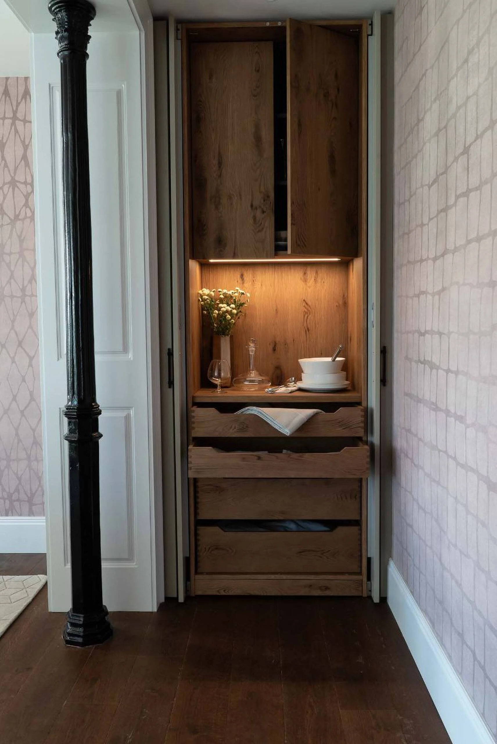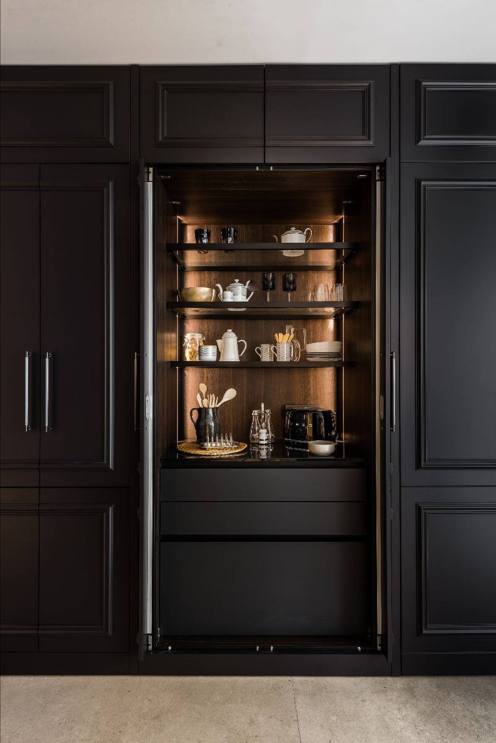 En nuestras tiendas de muebles de lujo y diseño podrás encontrar un amplio catálogo con diferentes opciones de desayunador. En esta ocasión queremos resaltar el diseño de nuestra cocina Habana, donde el desayunador cuenta con puertas escamoteables que permiten una mayor visibilidad y acceso; además de contar con iluminación en su interior. Este se encuentra completamente integrado con la cocina; haciendo uso del mismo material y diseño que el resto de los armarios, permitiendo que la discreción y lujo destaquen en total armonía con el resto de la cocina. Con un interior dividido por una parte superior donde es posible almacenar tazas y platos, seguido de un espacio donde poder colocar la cafetera que continuará con cajones de almacenaje permitiendo una mayor comodidad y facilitando la organización de los utensilios.