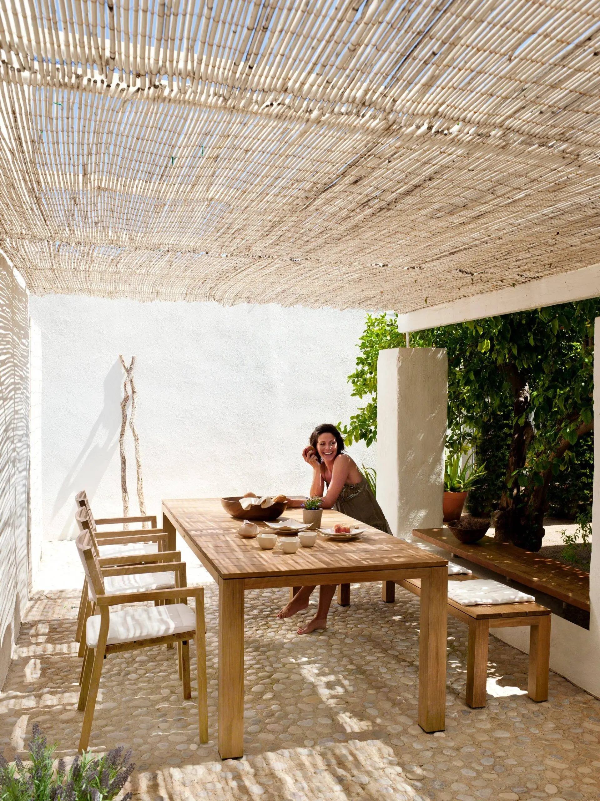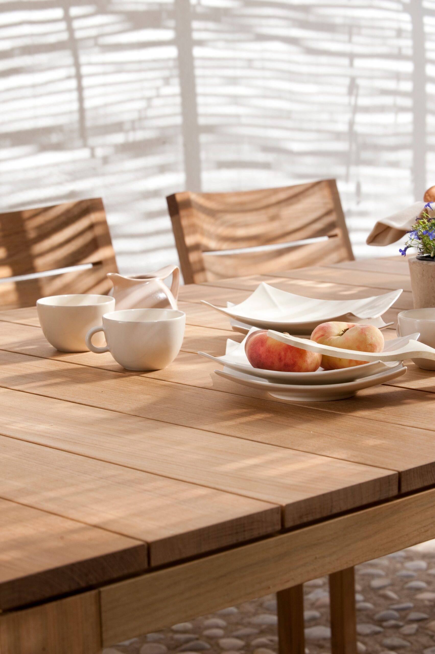La madera de teca reinventada en esta colección adquiere una nueva dimensión. Su apariencia moderna y robusta la convierte en una elección ideal para aquellos que buscan un estilo contemporáneo en su espacio al aire libre. La madera ha sido tratada y seleccionada cuidadosamente para garantizar su resistencia a los elementos, lo que la convierte en una opción perfecta para muebles de exterior.