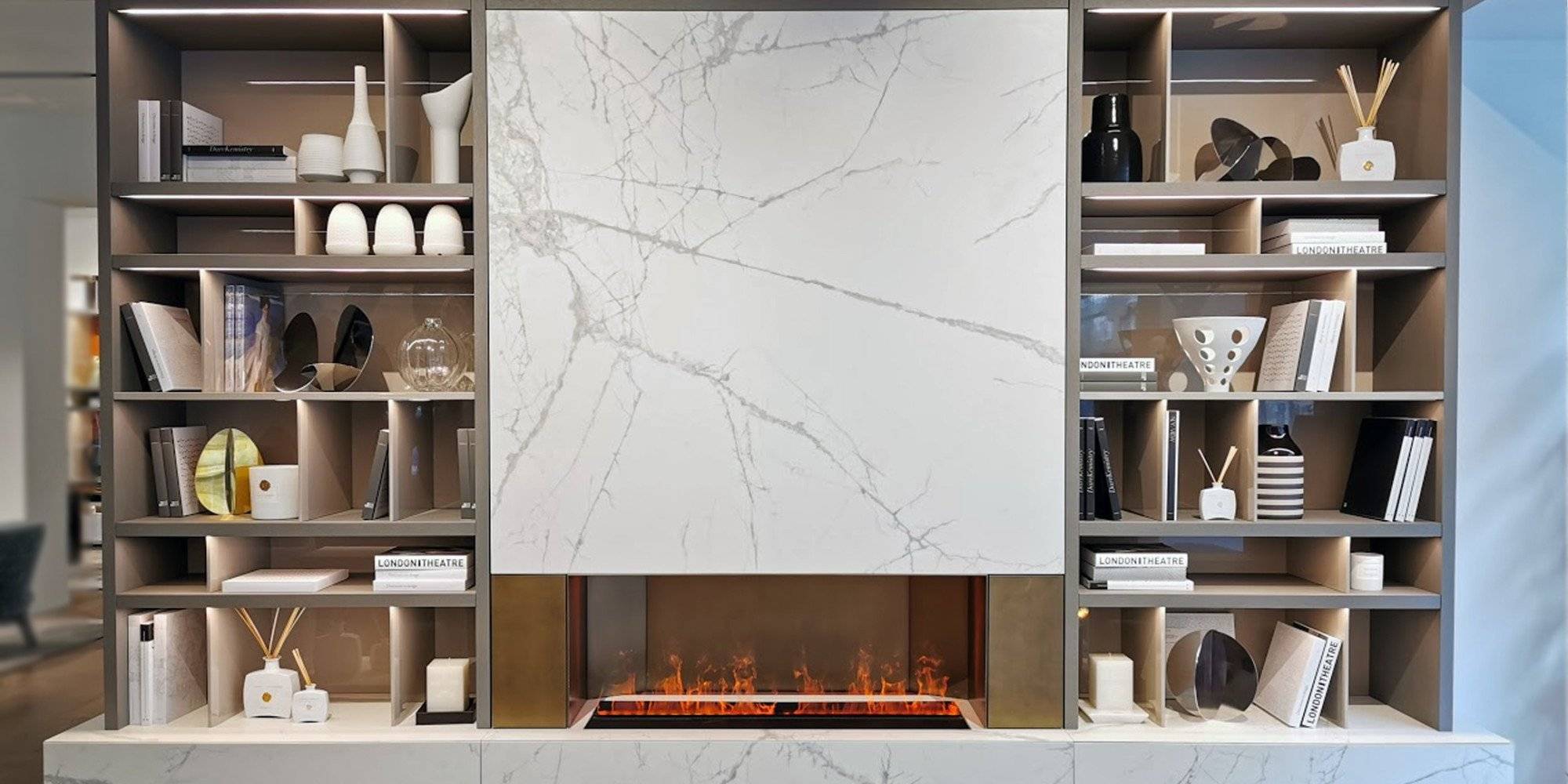 Nuestras líneas de muebles de cocina, muebles de baño y muebles de salón están pensadas para mantener el equilibrio con la arquitectura del espacio y para que no pasen desapercibidas ante ninguna mirada. Es el caso de esta estantería de diseño hecha a medida con chimenea eléctrica incluida.