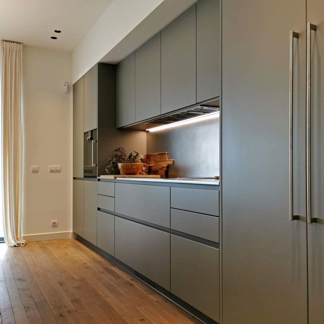 Similar al anterior tenemos este suelo de madera de alta gama instalado en una cocina, por lo que será más resistente. Las lamas en este caso son más finas mientras que el aspecto de la propia madera resulta más hidratado, generando un atractivo visual característico.
