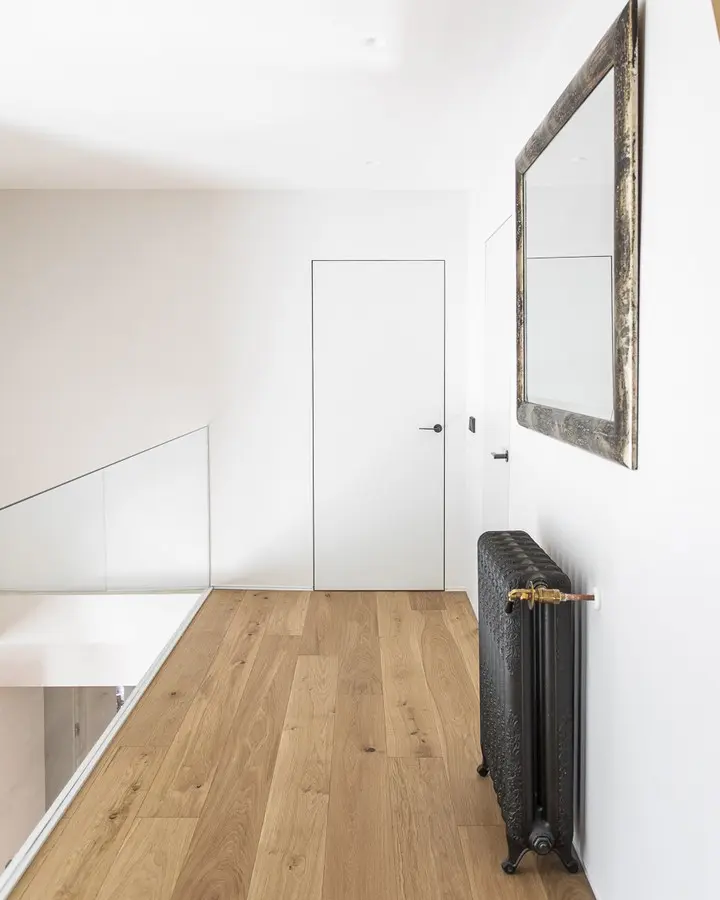 Este suelo de madera de diseño envejecida destaca por su belleza natural, el contraste entre sus lamas y los tonos marrones apagados que dialogan muy bien con el blanco del resto del ambiente. Se trata de una madera exclusiva ideal para estilos clásico-contemporáneos.