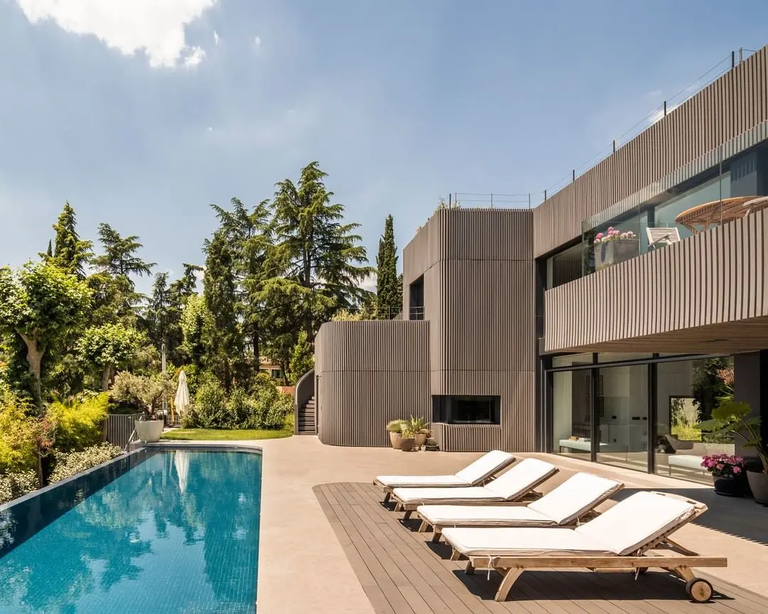 Mención aparte merecen las maderas de exterior, puesto que tienen que tener una resistencia y durabilidad extras. En este caso se ha utilizado una madera con capa protectora ideal para zonas de piscina. Como se puede apreciar, la funcionalidad no está reñida con el diseño, y esta madera exclusiva embellece el ambiente.