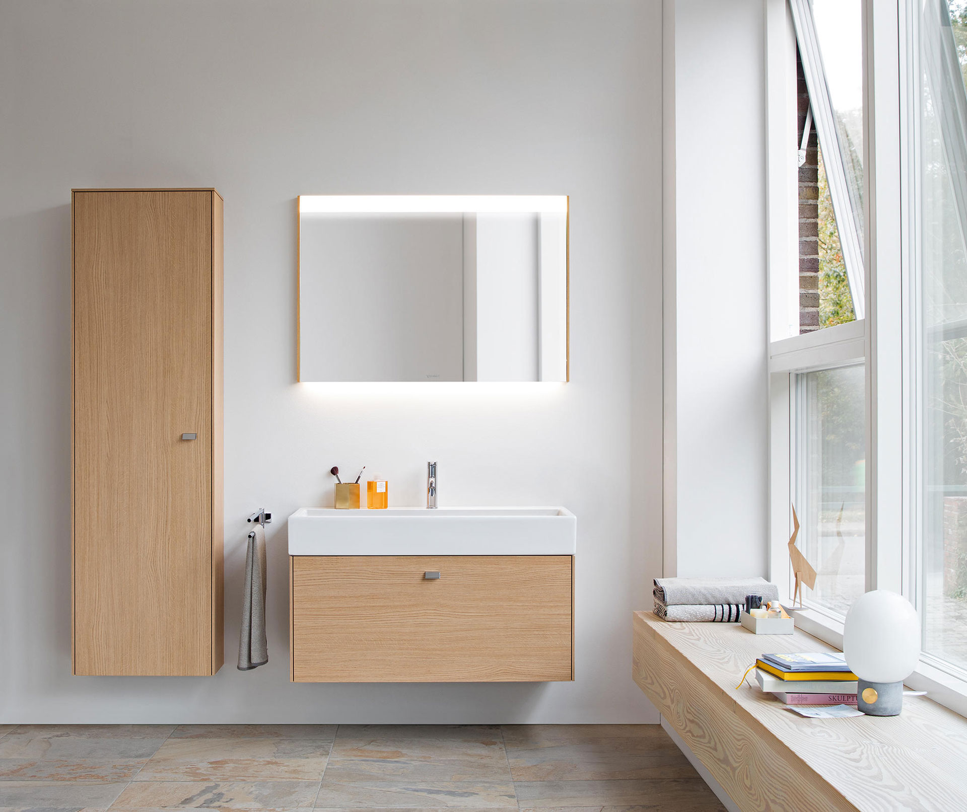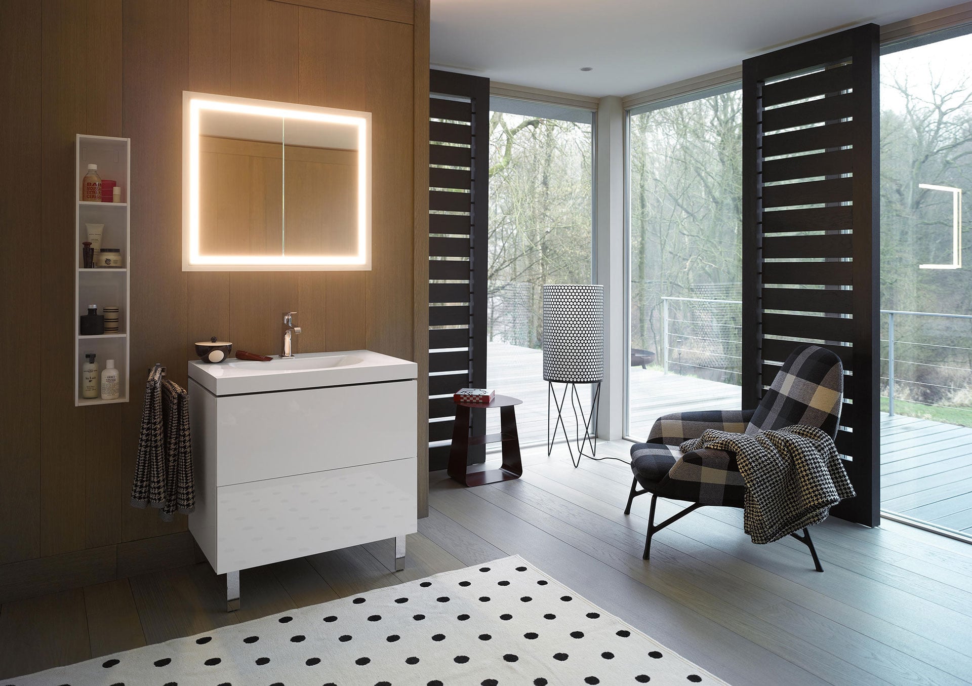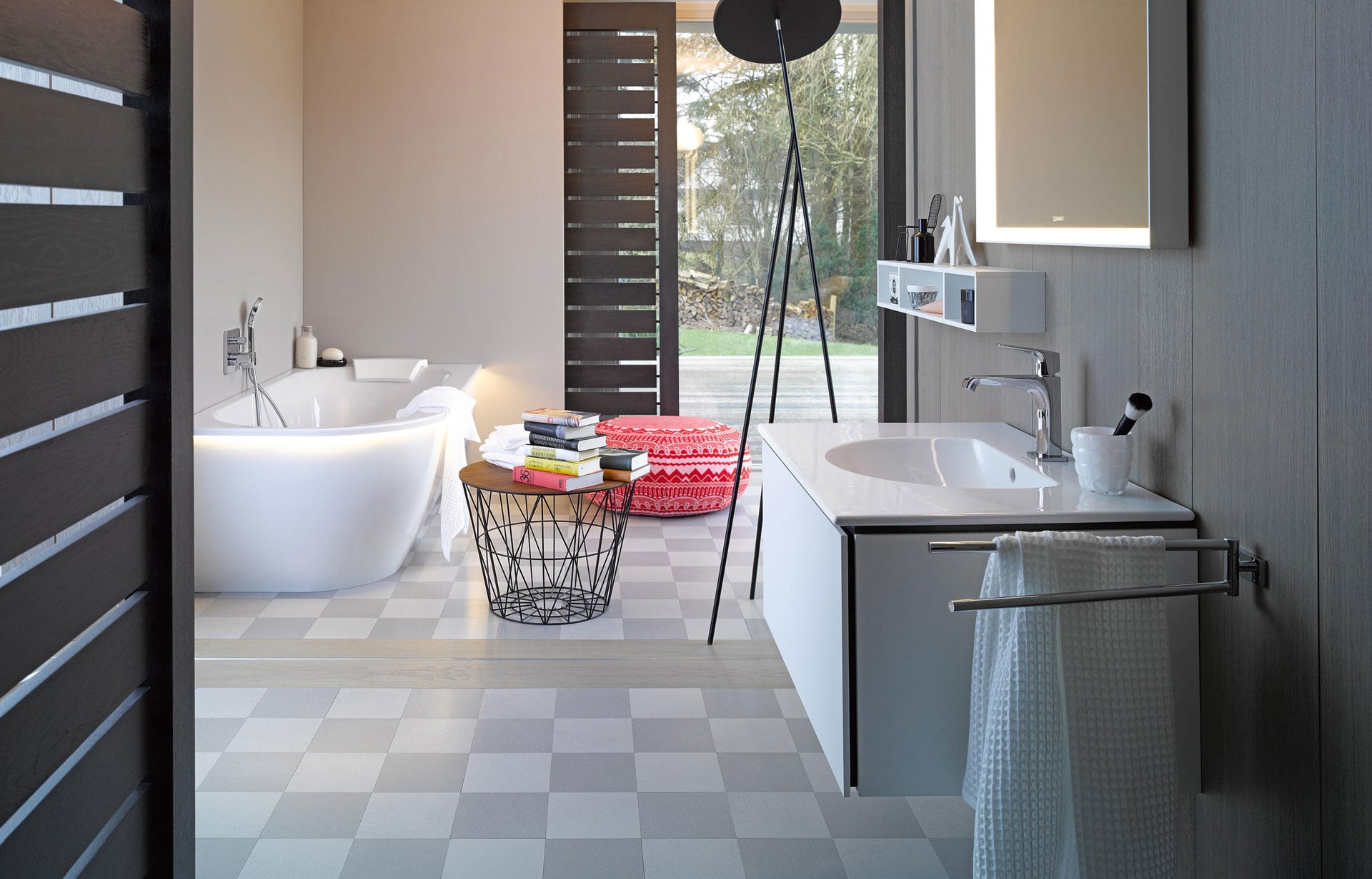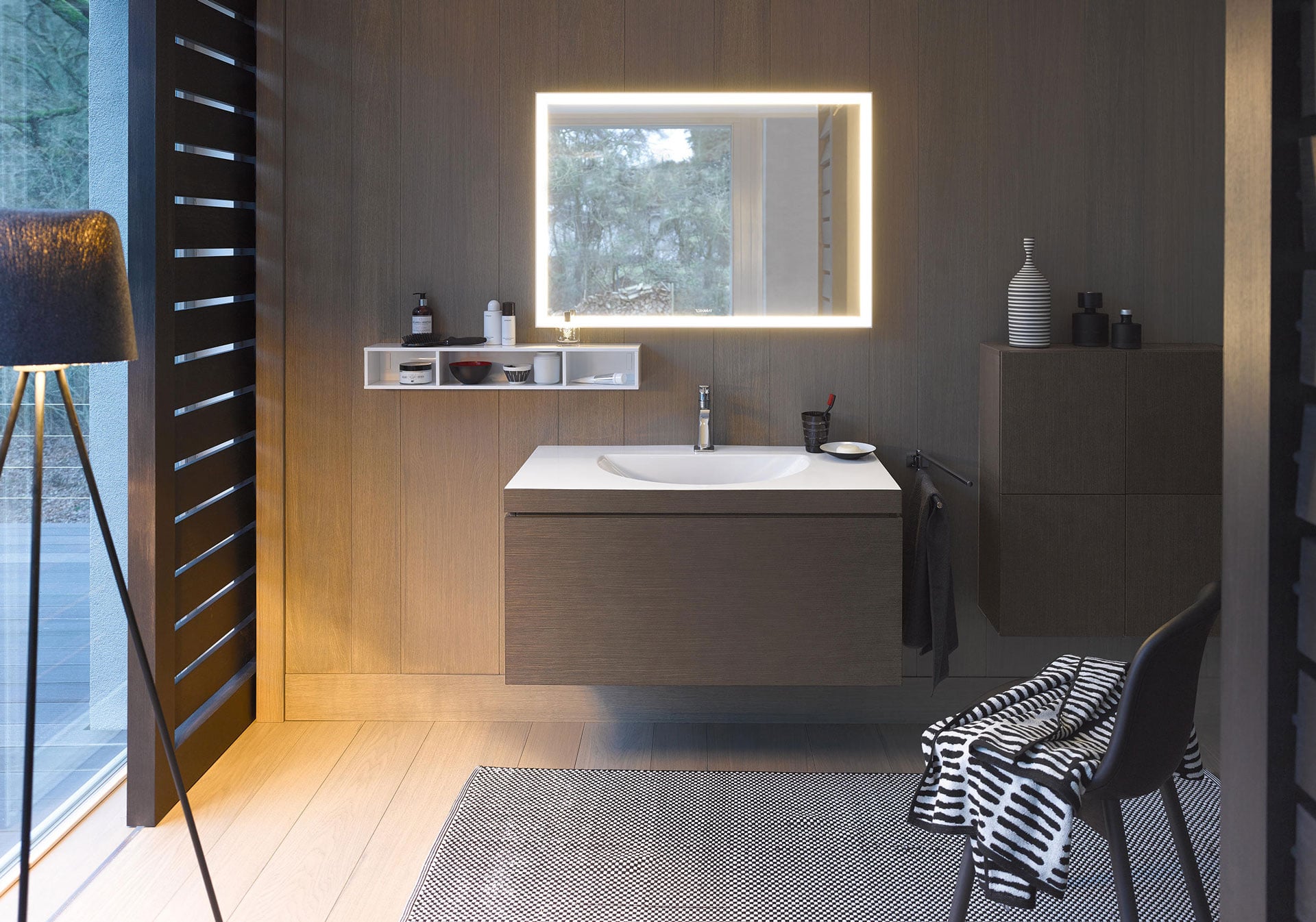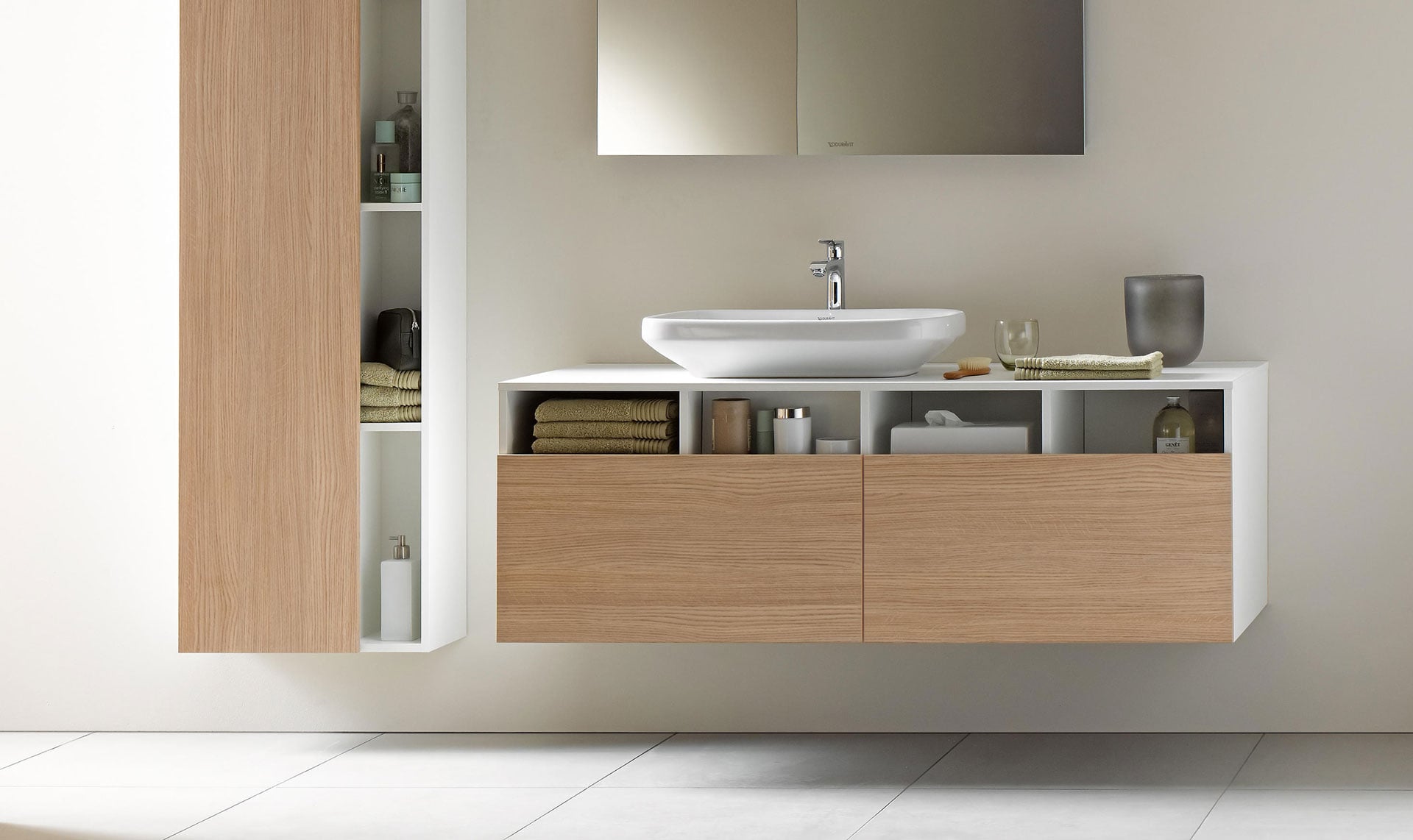 Duravit offers many possibilities to equip the bathroom in a customized way. From the washbasin, mirror, lighting, shelves, accessories to the faucets. Duravit products combine perfectly with each other. The corresponding furniture creates space to store utensils. Different finishes such as decorated, lacquered, or authentic wood veneer add even more individuality to the bathroom.