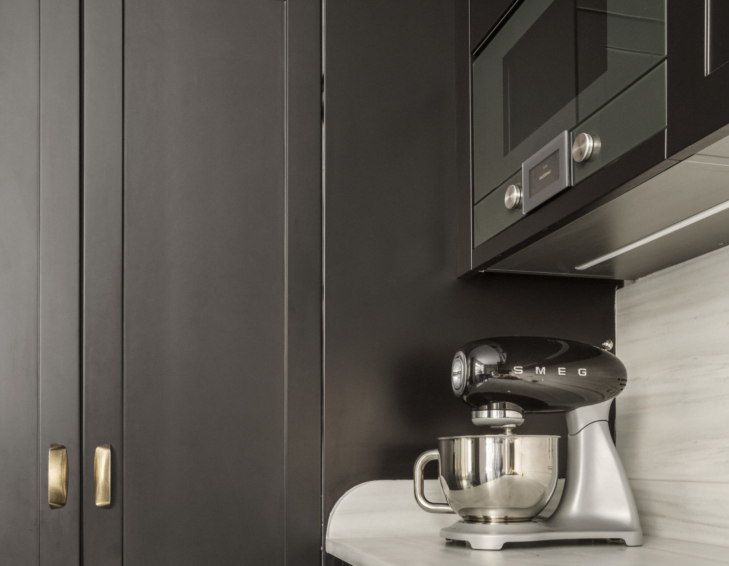 Small appliances also have their place: coffee makers, juicers, food processors, microwaves, among others. We enjoy designing cabinets with retractable doors to provide them with a comfortable space while keeping them out of sight when the kitchen is tidy. In our luxury kitchens, we custom-design this type of furniture, incorporating a sophisticated storage concept akin to a minibar, with wooden or steel-lined drawers and finishes in smoked glass.