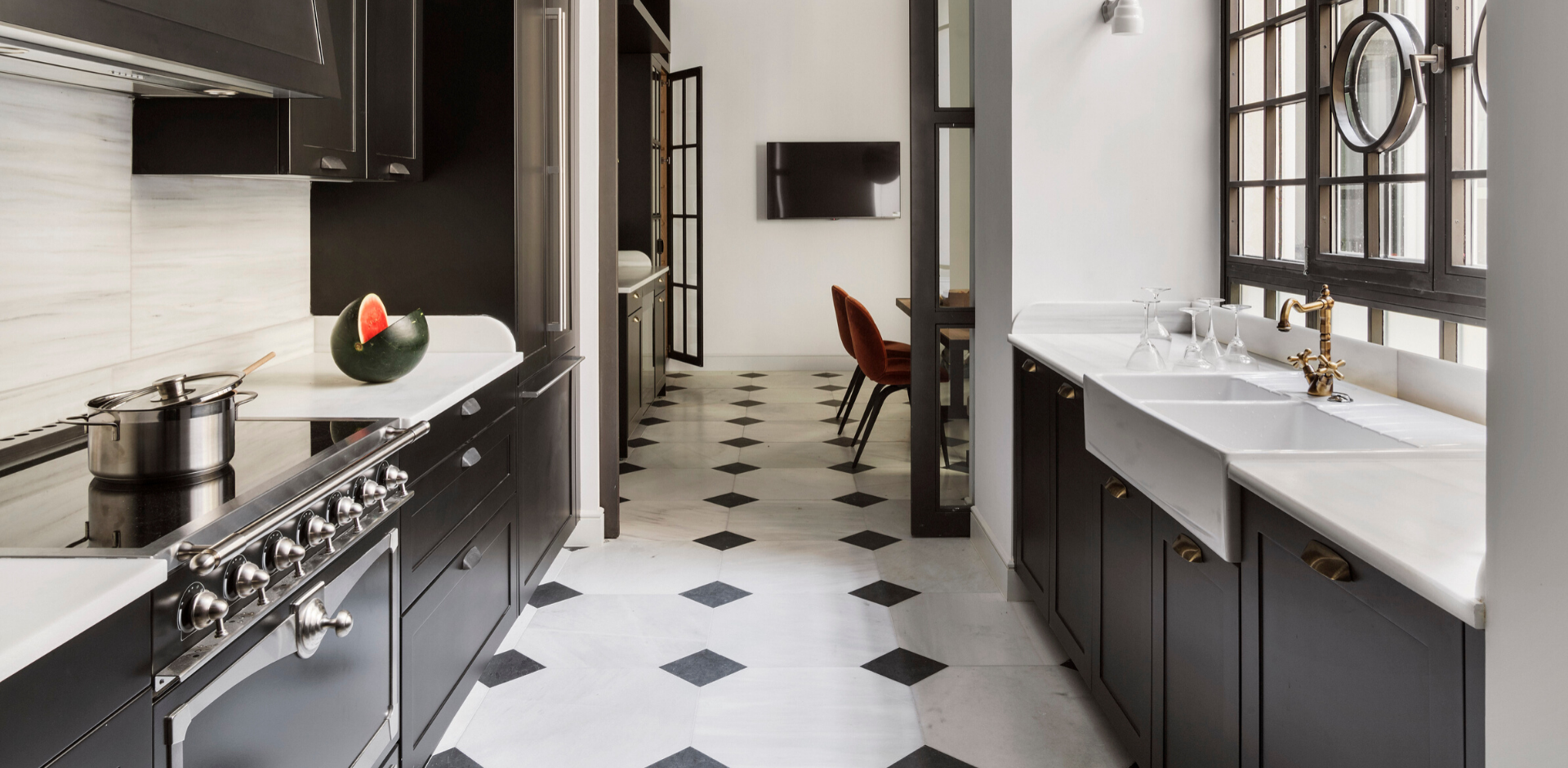 The Cornuchef line is more contemporary and affordable. It adapts to the demands of modern urban life. It incorporates the best of La Cornue: legendary vaulted oven and the indispensable plate “coup de feu”. All kitchens are made to order, one piece at a time. They can be customized thanks to a palette of 25 colors of enamel and two metallic finishes (chrome and shiny stainless steel or satin brass).