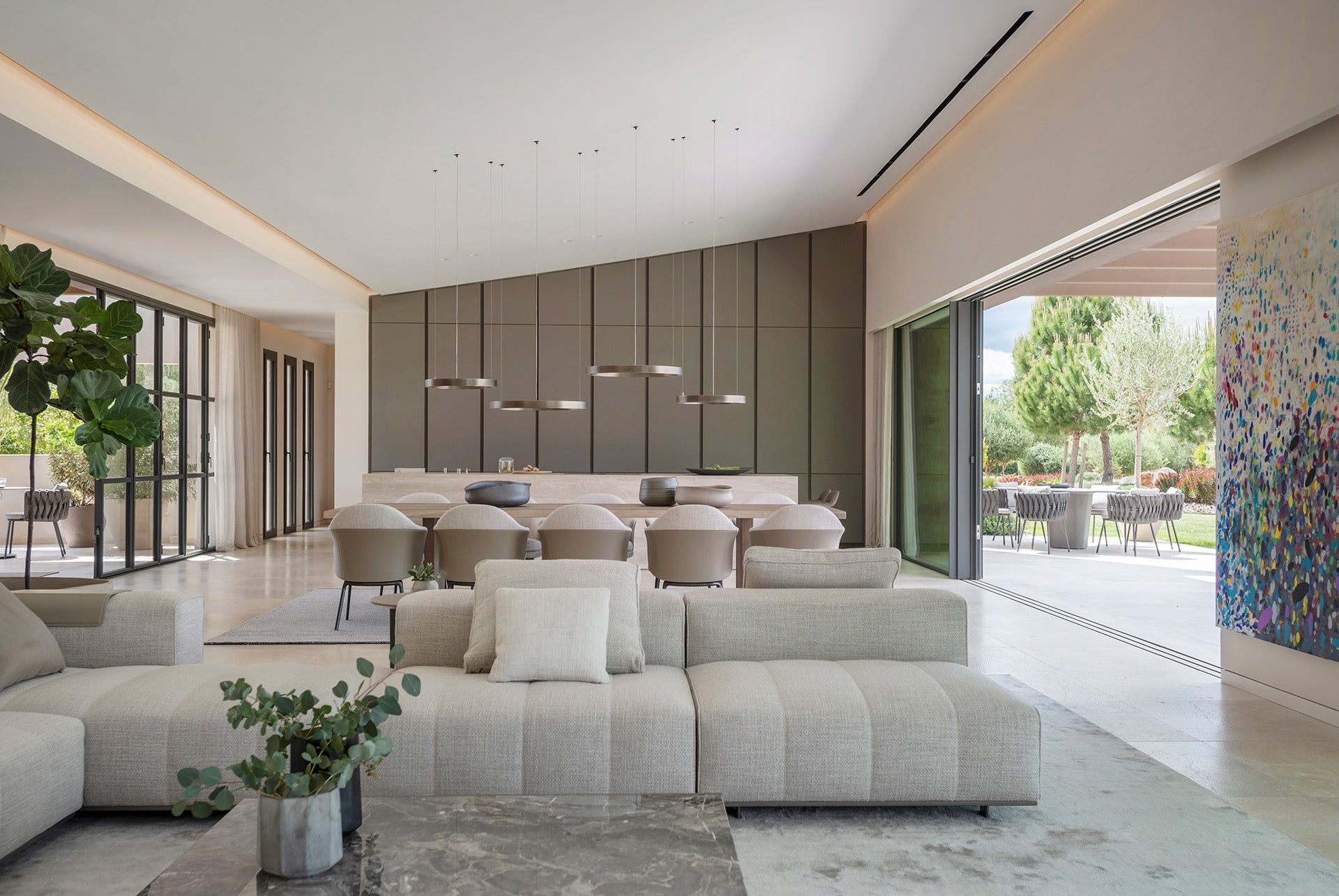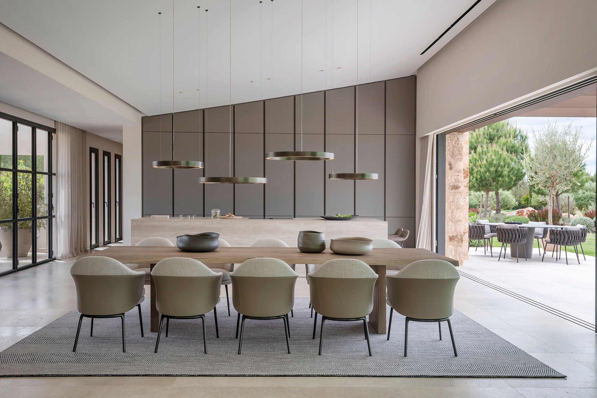 The interior is structured around open spaces bathed in natural light, where the kitchen, dining room, and living room share a serene, fluid, and functional atmosphere. The formal sobriety, combined with the selection of Terraza Balear furniture, defines a contemporary, uncluttered style, designed for everyday enjoyment in balance with the surroundings.