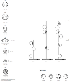 Contains 6 transparent pendants and measures 1.8 m high with a round base of Ø350 mm.