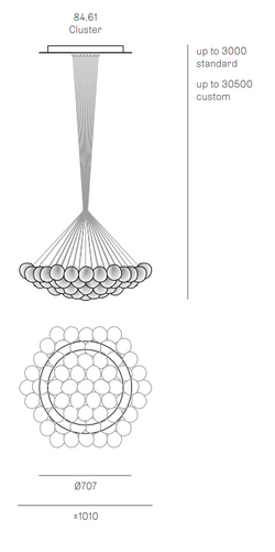 The 84.61 Cluster Column ceiling lamp, designed by Bocci, is a suspended lighting installation composed of 61 blown glass globes with an internal copper mesh structure. Its sculptural design and warm lighting make it a stunning centerpiece for interiors.