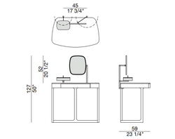 The Maskara vanity, designed by E. Gallina in 2015, is a refined piece that combines solid ash wood with a marble top and a central drawer. It offers customization options in materials, colors, and additional accessories, such as a stool and a rotating mirror with drawer.