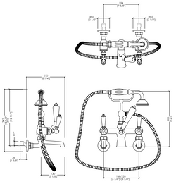 Simple and refined design for an elegant bath and shower mixer – deck-mounted with hose and handle, featuring fine black porcelain levers. Made of brass, it is available in the following finishes: antique copper, bronze, chrome, polished nickel, black nickel, satin nickel, light gold, and rose gold.