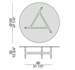 A collection of side and coffee tables with a brushed brass base coated with clear varnish. It features a central decorative element in solid Canaletta walnut, which anchors the top and leg supports. The tabletop is available in tempered and beveled glass (12 mm thick) or marble.