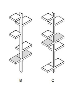 The Unicode shelving unit , a simple vertical metal structure with bold lines, extends along the wall, creating a staggered arrangement of shelves in precious stone or metal. With its sculptural composition, it establishes a graphic presence that balances functionality and art.