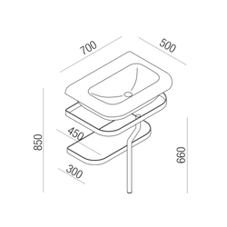 Washbasin with a structure that includes a towel rail and shelf. The structure is available in painted steel in white, light gray, dark gray, or with a brushed finish. Several customization options are available for the washbasin colors.