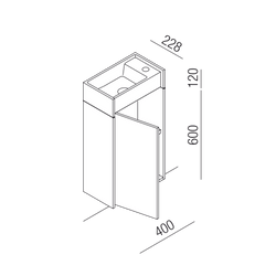Small 20x40 cm wall-mounted washbasin, available in various concrete colors and accompanied by an MDF cabinet with a natural oak finish or RAL colors upon request. This model features a free-flowing drain and the option of a single-hole tap.