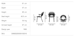 The Trinidad 3399 chair with arms and a solid wood seat, designed by Nanna Ditzel in 1993, is an iconic piece inspired by the elaborate lattice facades the designer observed during her trip to Trinidad. Its CNC-cut backrest creates dynamic patterns of light and shadow, resulting in a unique and sophisticated visual effect. This version, with a wooden seat and armrests, offers ergonomic comfort ideal for contemporary residential or commercial spaces.