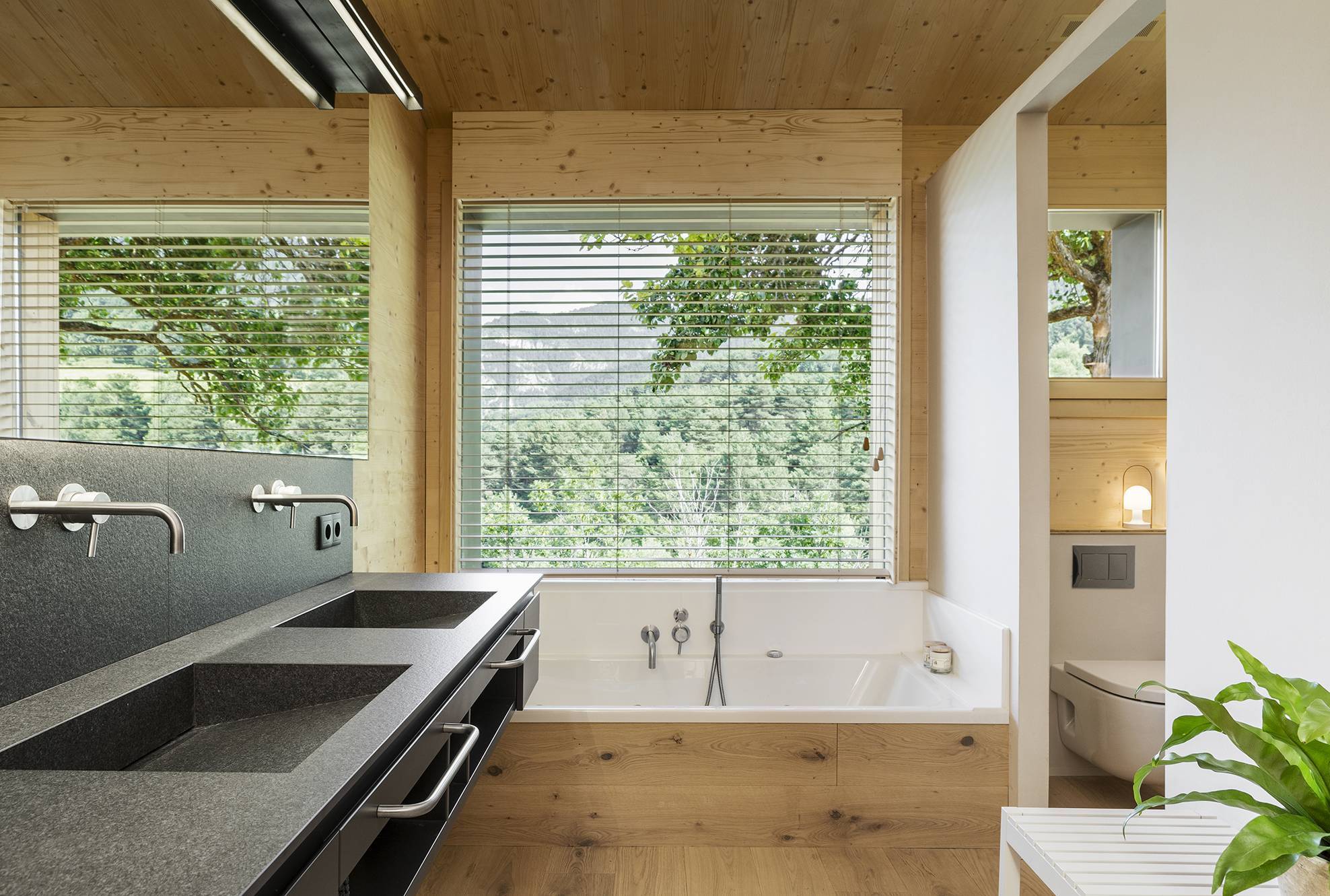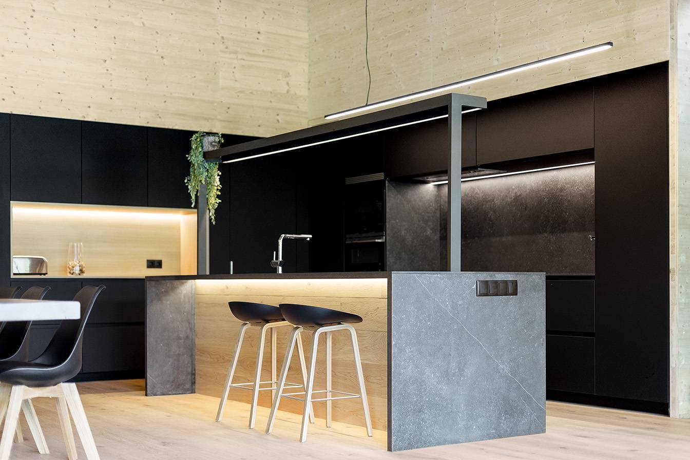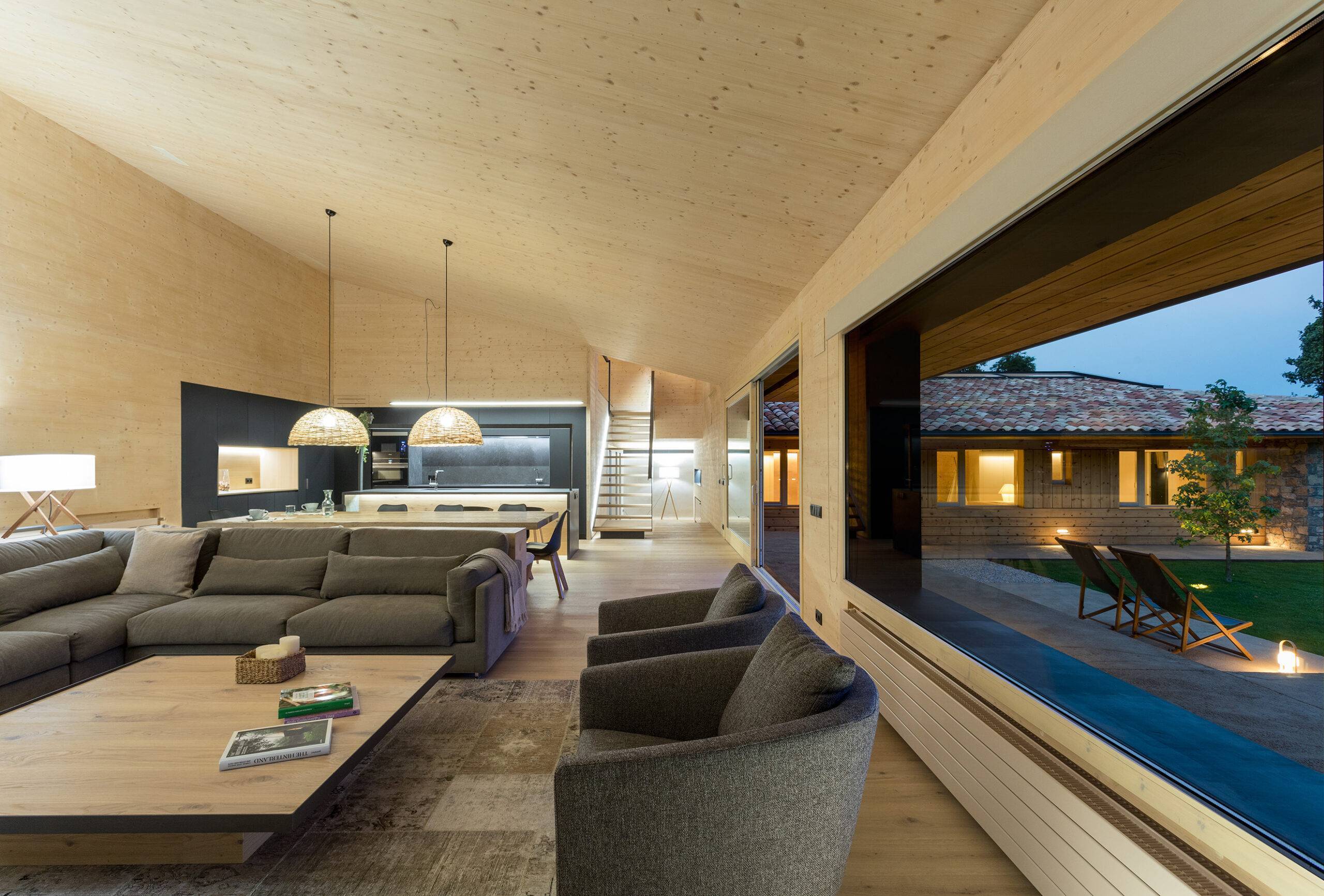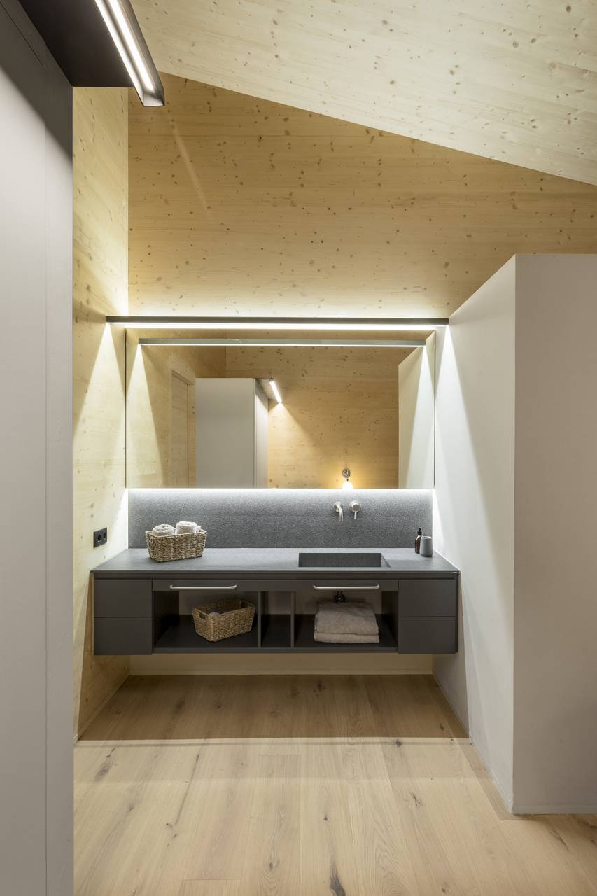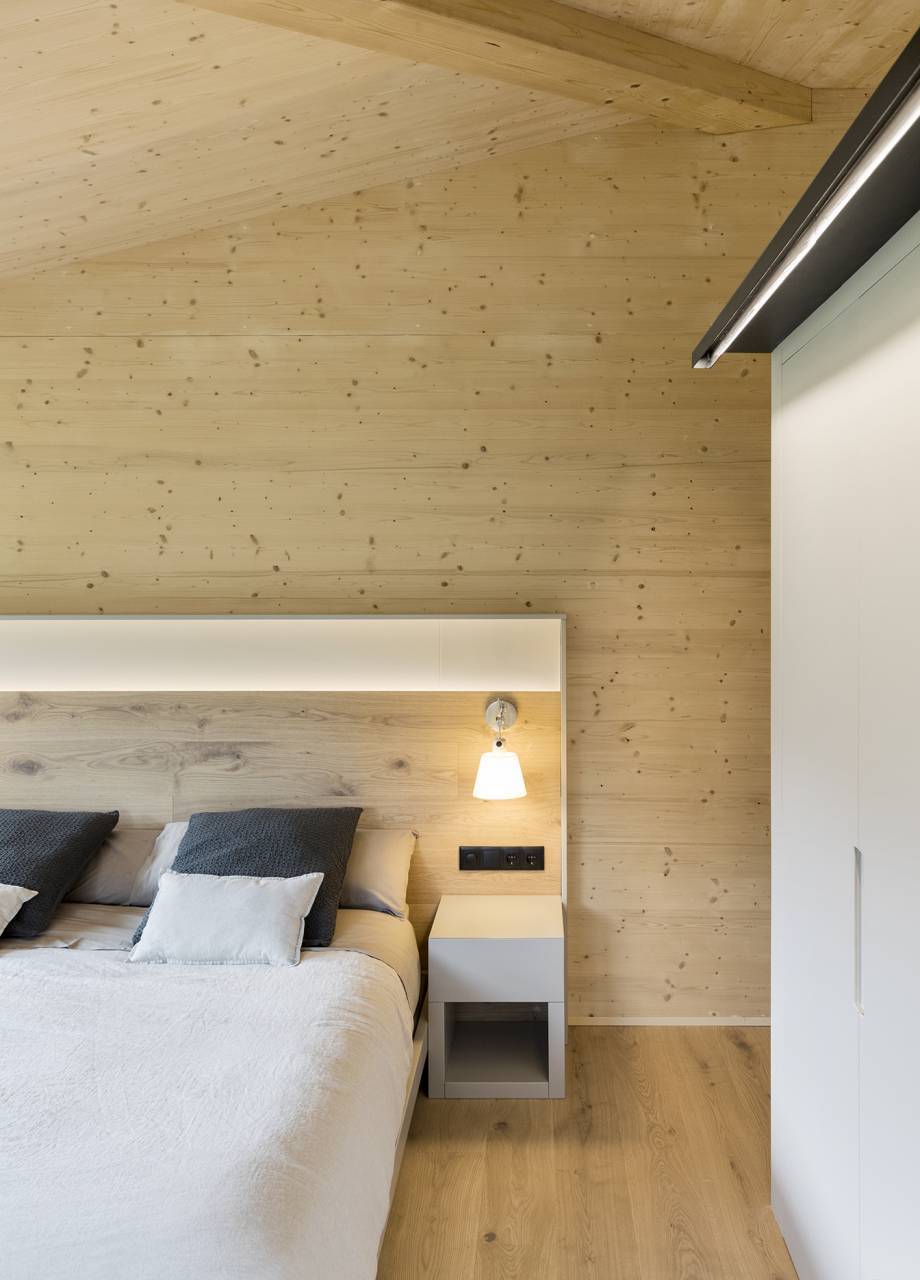 Wood is the star of the interior, with walls and ceilings covered with spruce soffits and natural oak floating parquet flooring in similar tones, respecting tradition and promoting a modern design.
