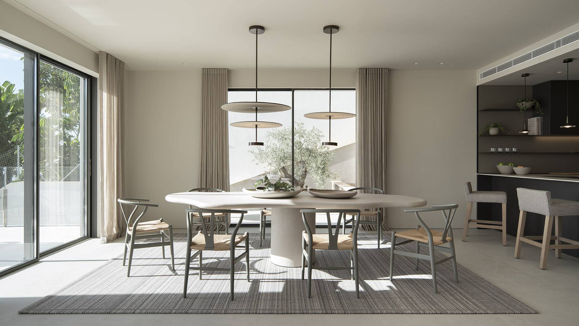 La cocina y los armarios de Poliform aportan un equilibrio perfecto entre funcionalidad y elegancia, mientras que un diseño de iluminación cuidadosamente planificado realza la atmósfera del espacio. El mobiliario de diseño, tanto en interiores como en exteriores, junto con una cuidada selección de arte y decoración, completan el espacio, creando un entorno sofisticado y perfectamente equilibrado.