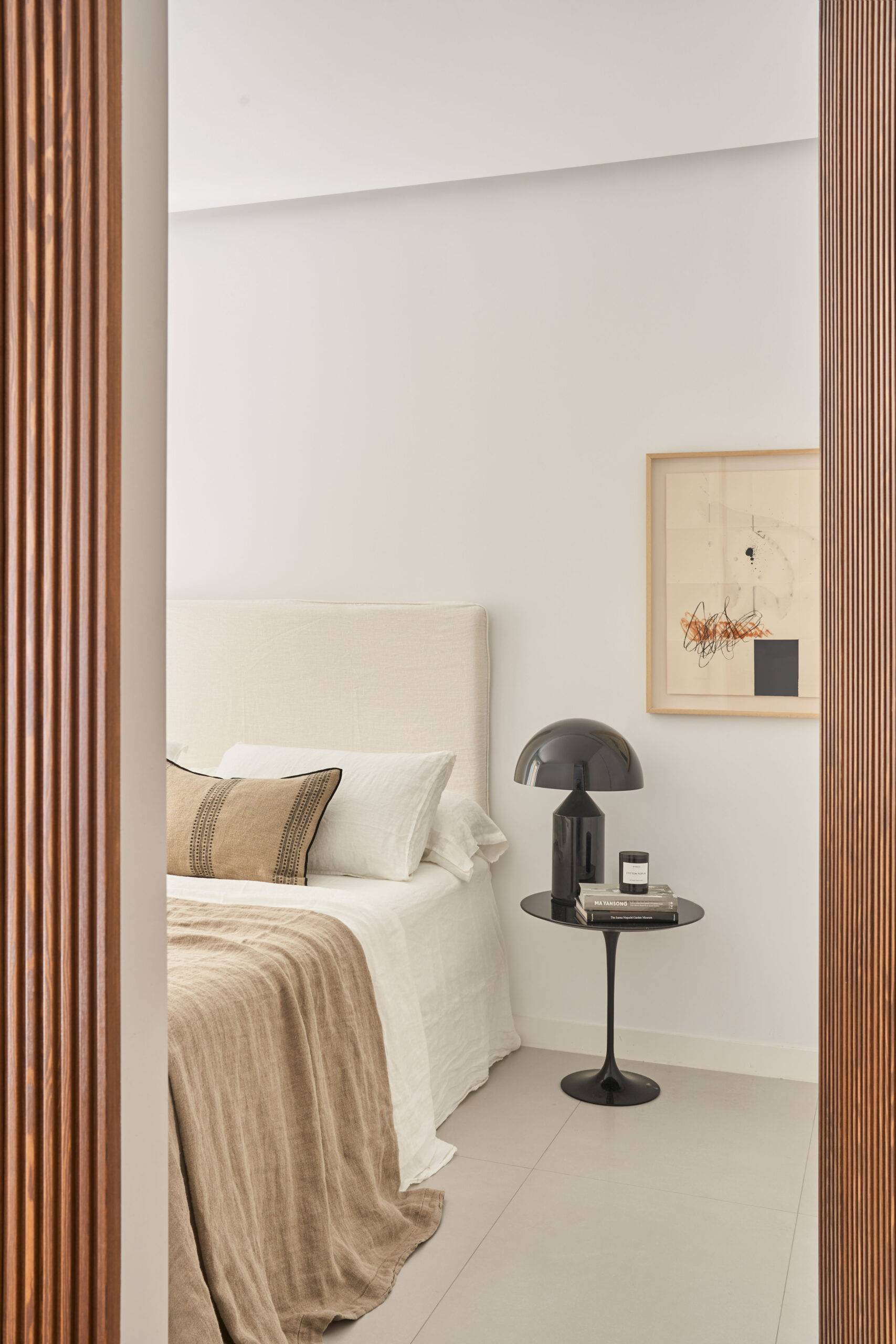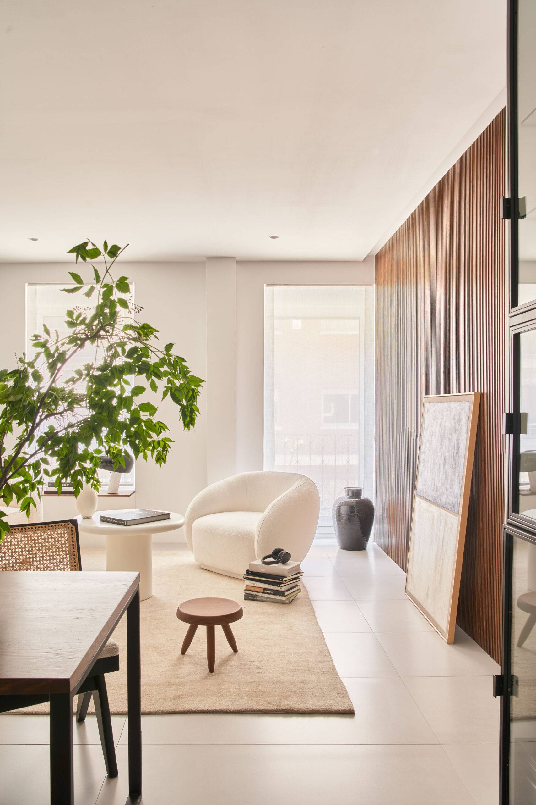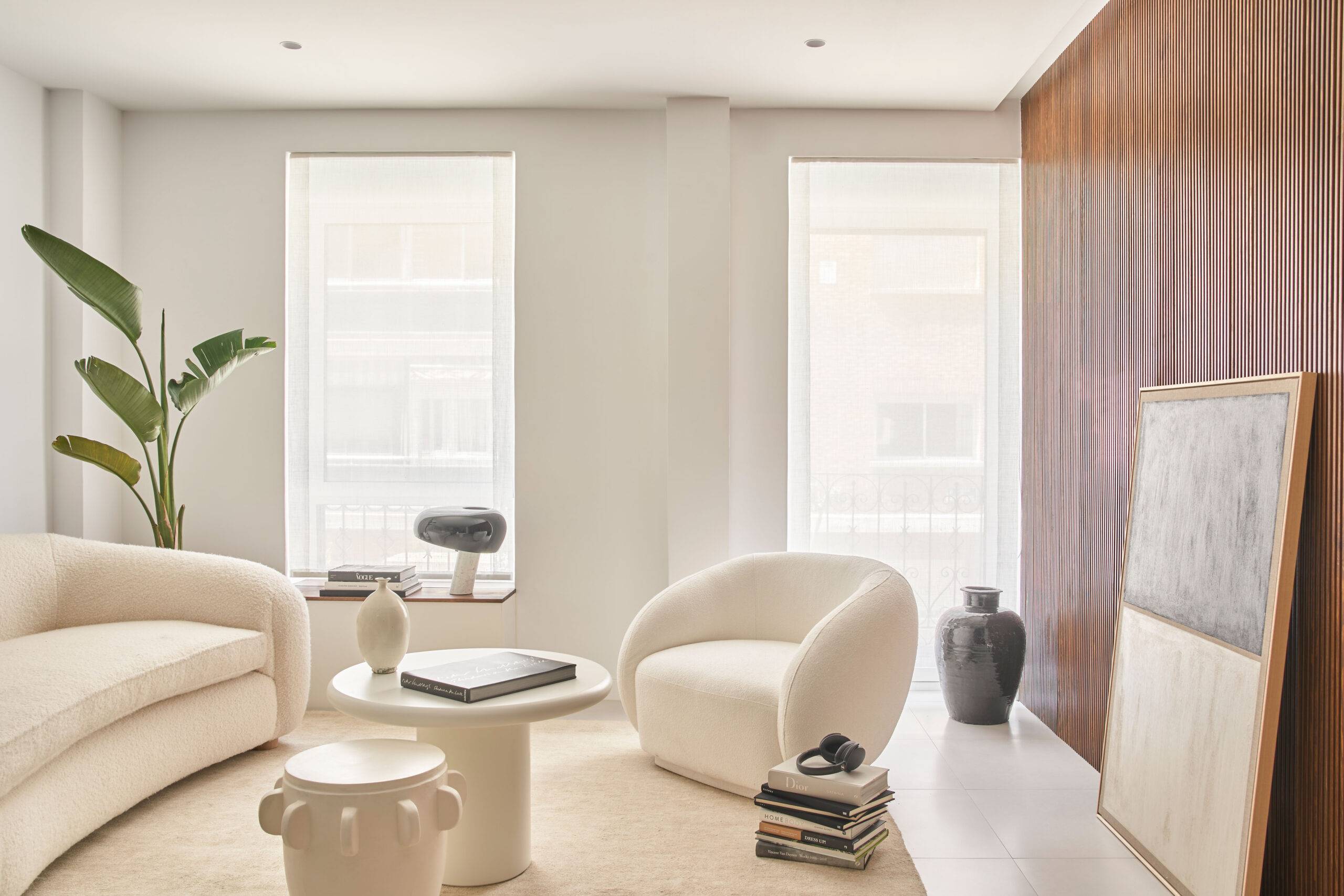 In the Guindalera neighborhood of Madrid, there is a unique and modern residence where the color palette, including taupe, beige, gray, and cream tones, creates a serene and tranquil atmosphere throughout the home.
