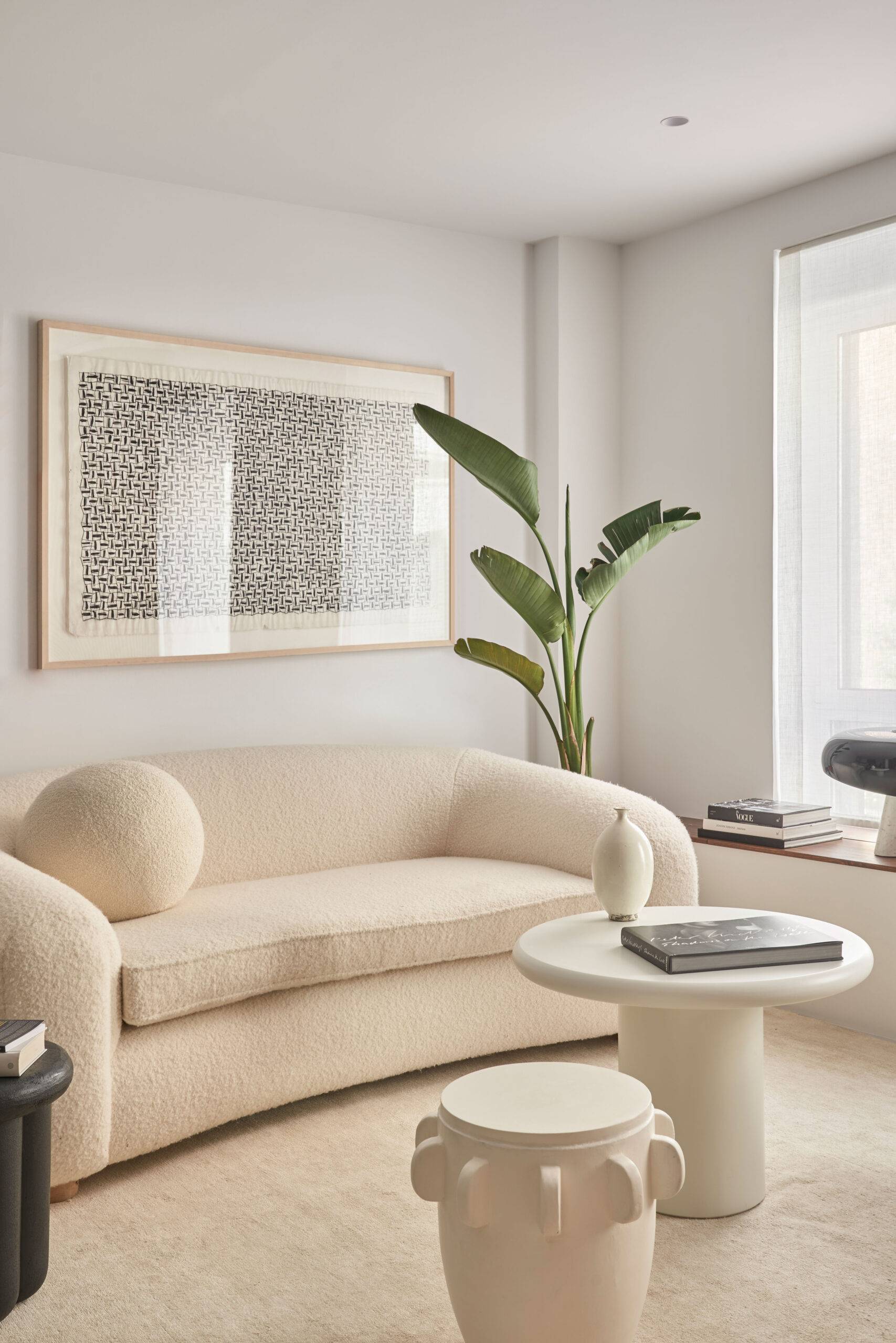 The furniture, in soft and relaxing tones, brings brightness and freshness. The sofa and accompanying artwork stand out, and classics like the walnut Berger stool, designed by Charlotte Perriand, complete a unique and inspiring decoration.