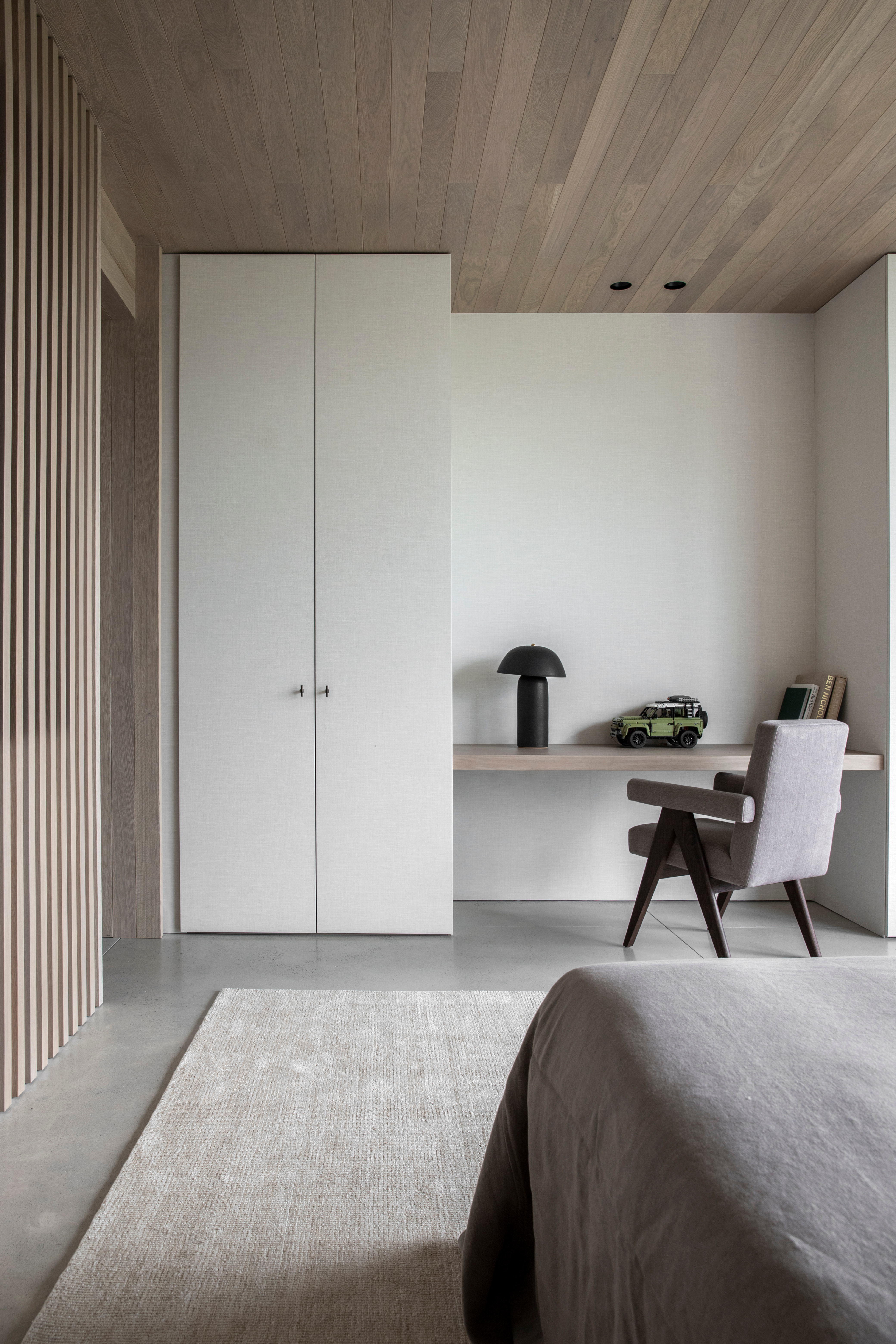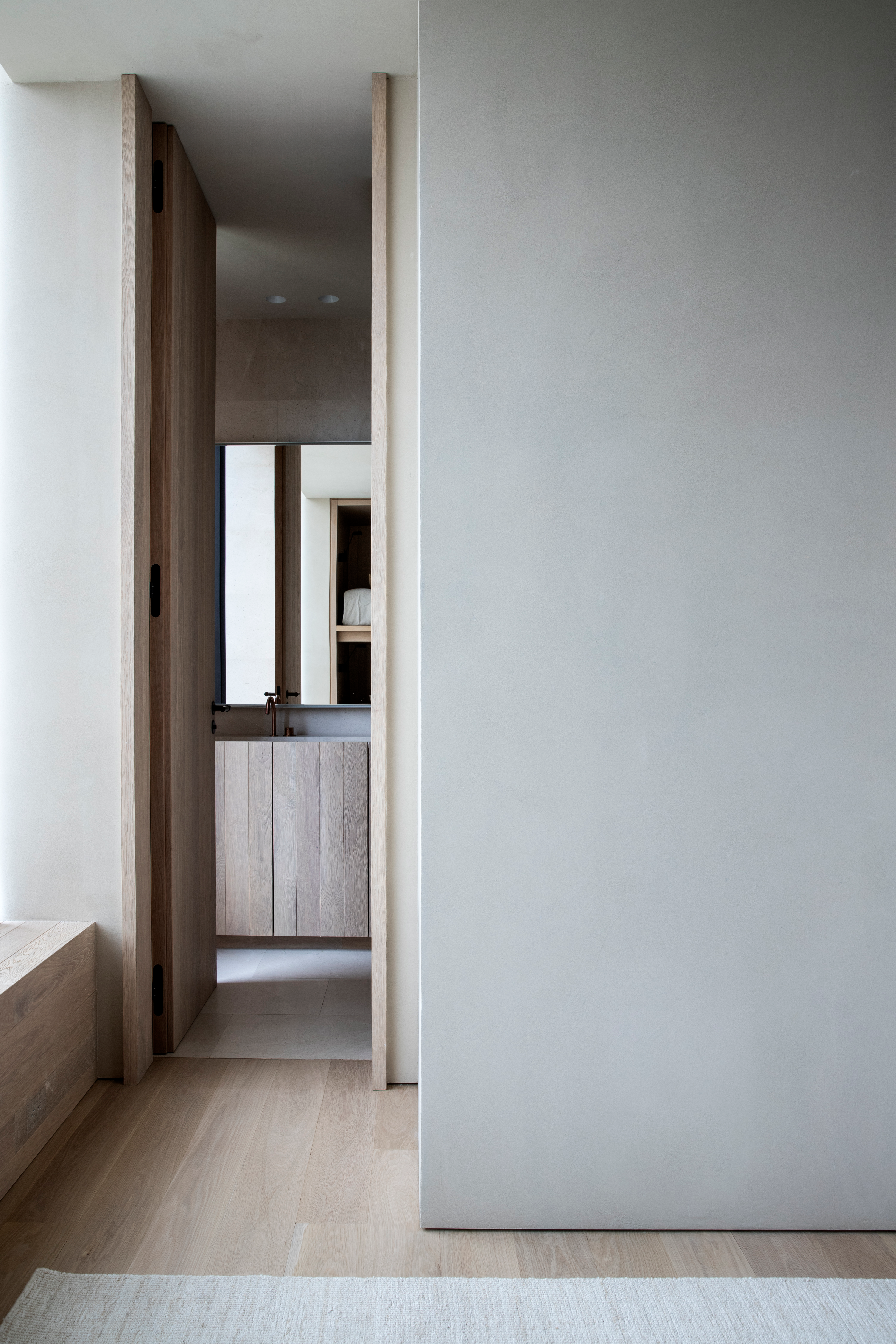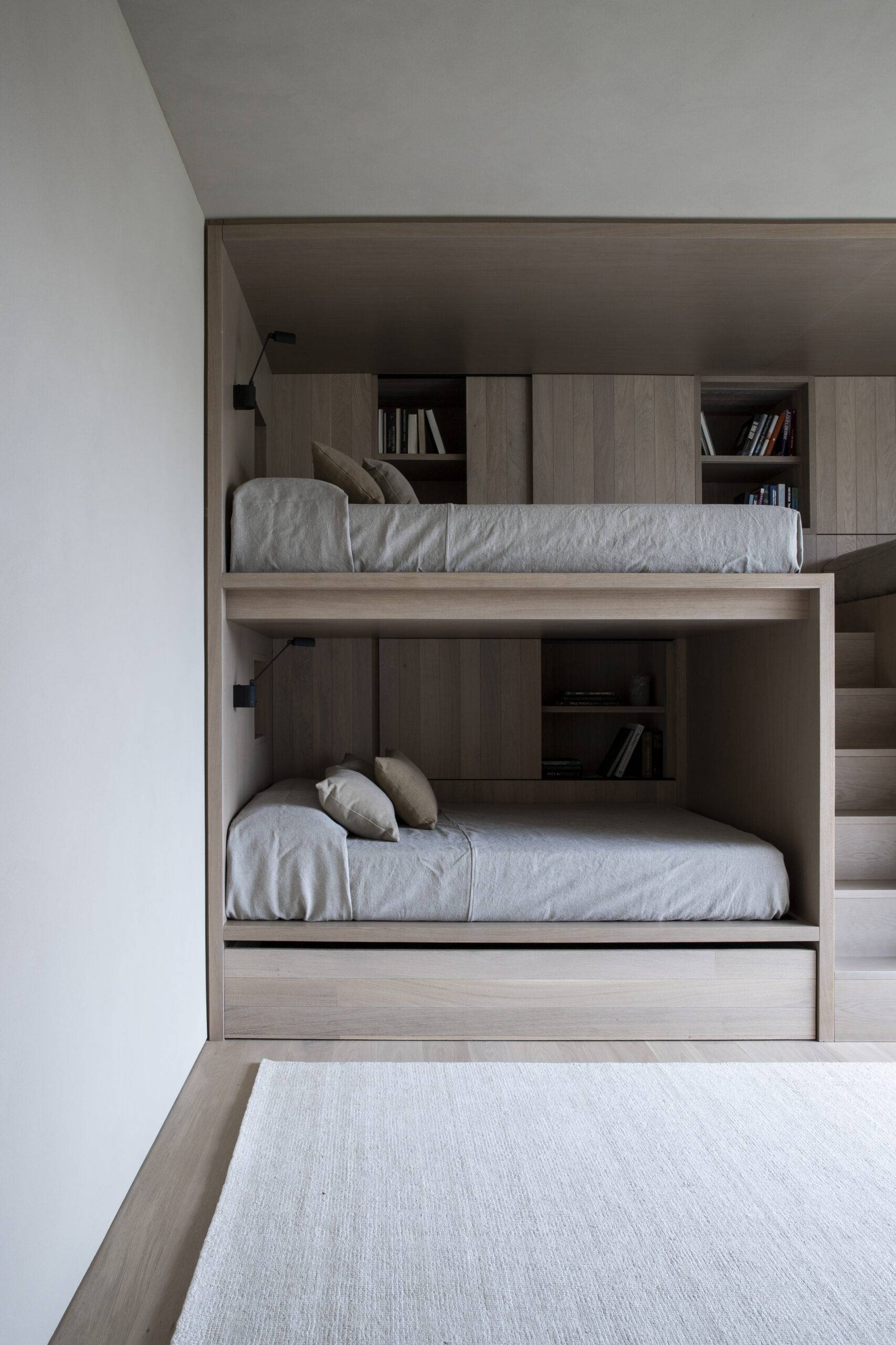 Ceilings, walls, wardrobes and cladding are dressed with the same wooden skin, which envelops and connects the rooms, and is integrated with a soft and natural chromatic range, inspired by the light of the coastal environment, and durable, sustainable and aesthetic materials. A spatial and visual continuity, where the bleached oak skin goes beyond and extends into a custom-designed kitchen, as the heart of the house and the centre of socialising and family enjoyment; and the bathrooms.