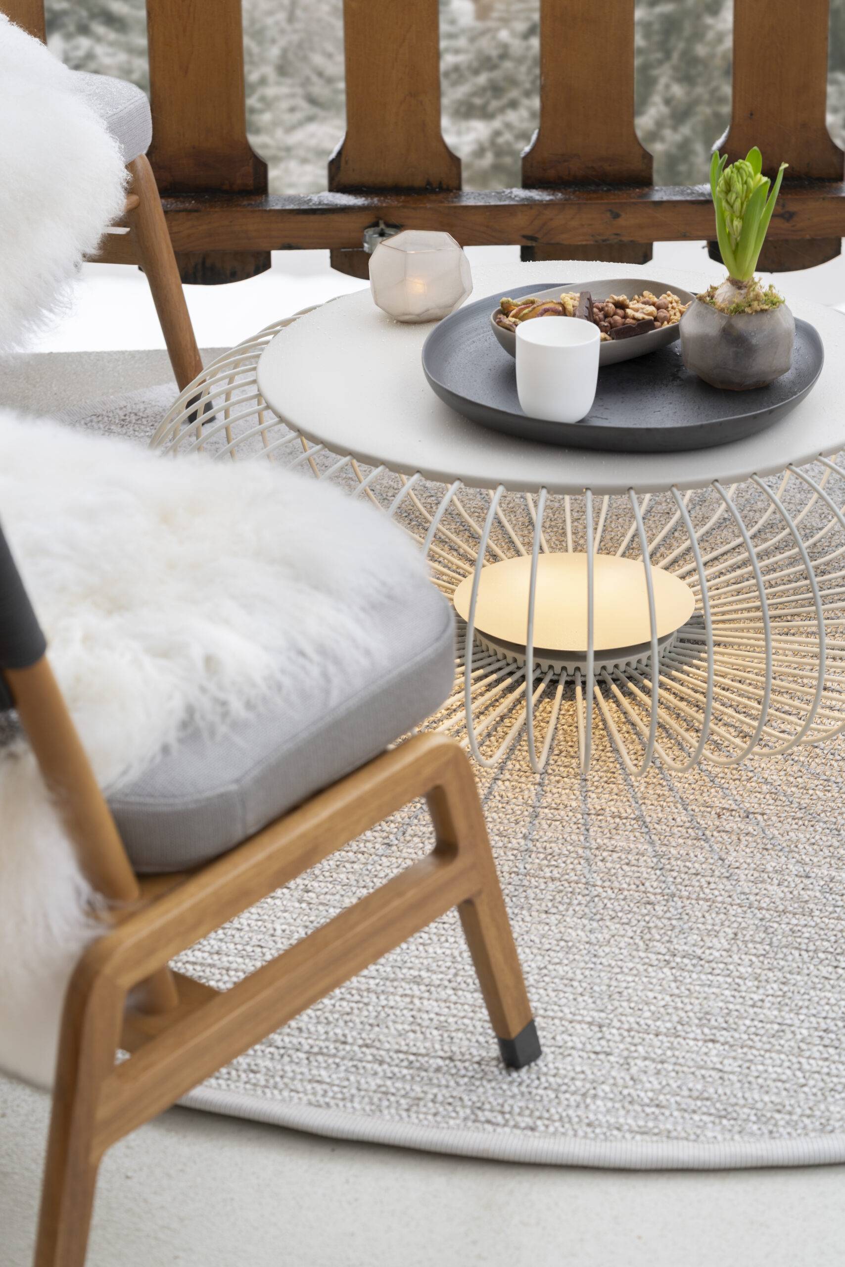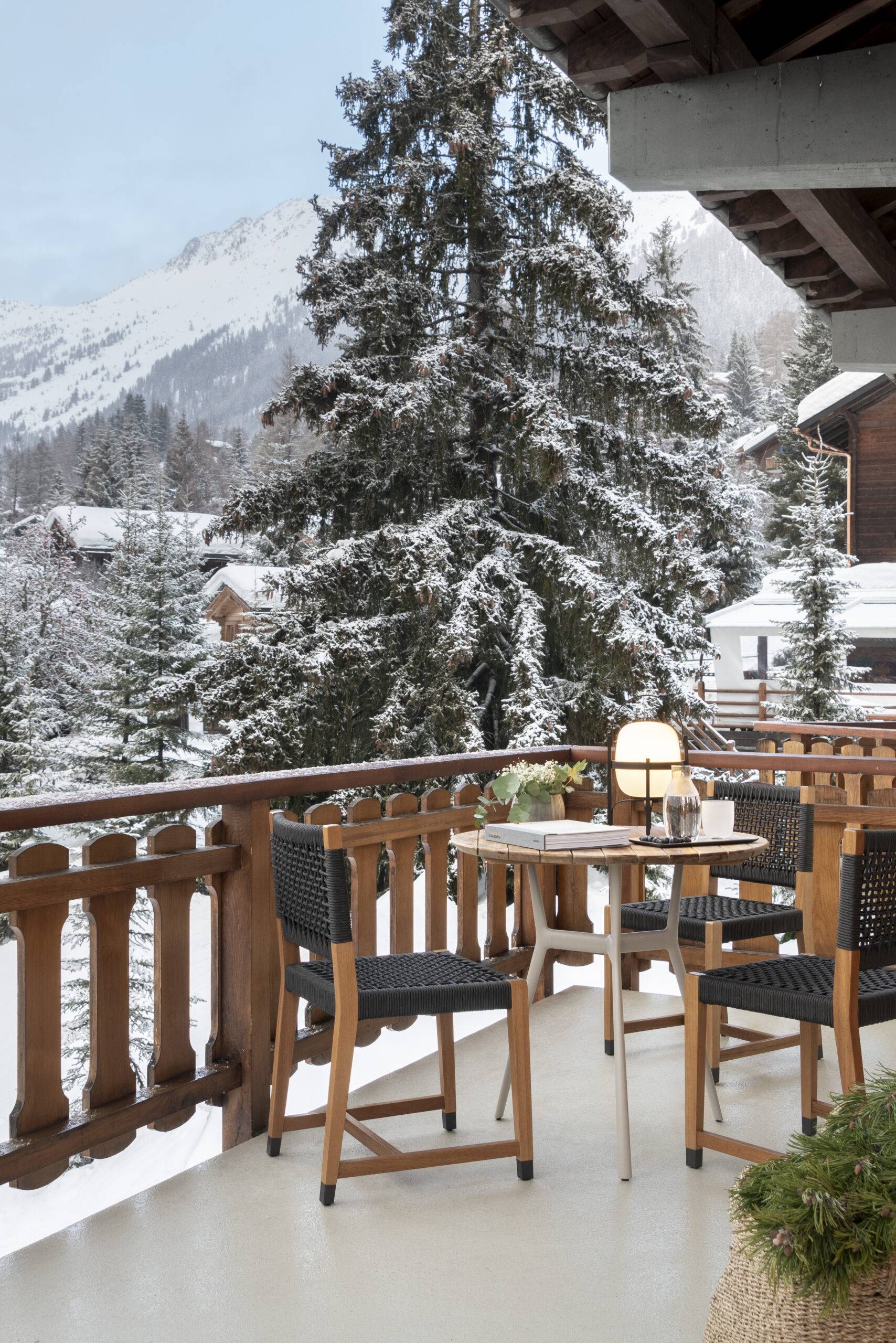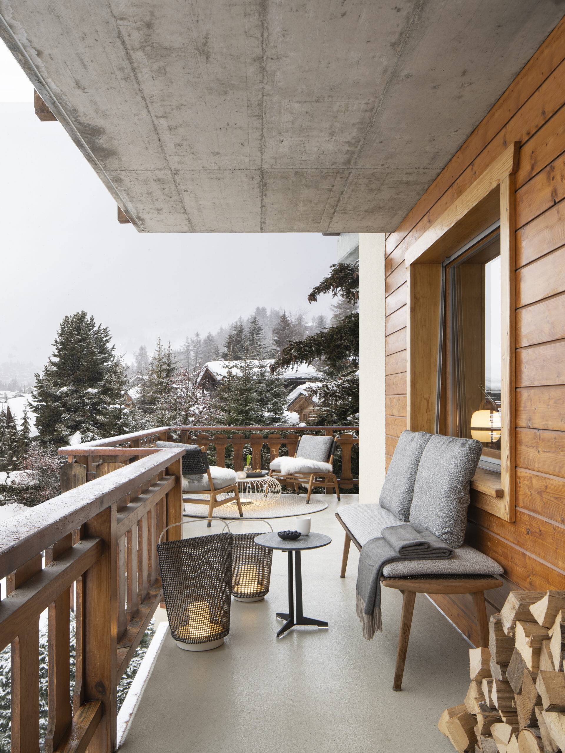 The outdoor spaces are a natural extension of the interior, allowing residents to immerse themselves in the beauty of the surrounding nature without leaving home. With predominance of wood and neutral colors, the outdoor furniture invites to enjoy the magnificent views while relaxing with soft lighting, thus creating the perfect setting for moments of tranquility and contemplation in the Swiss mountains.