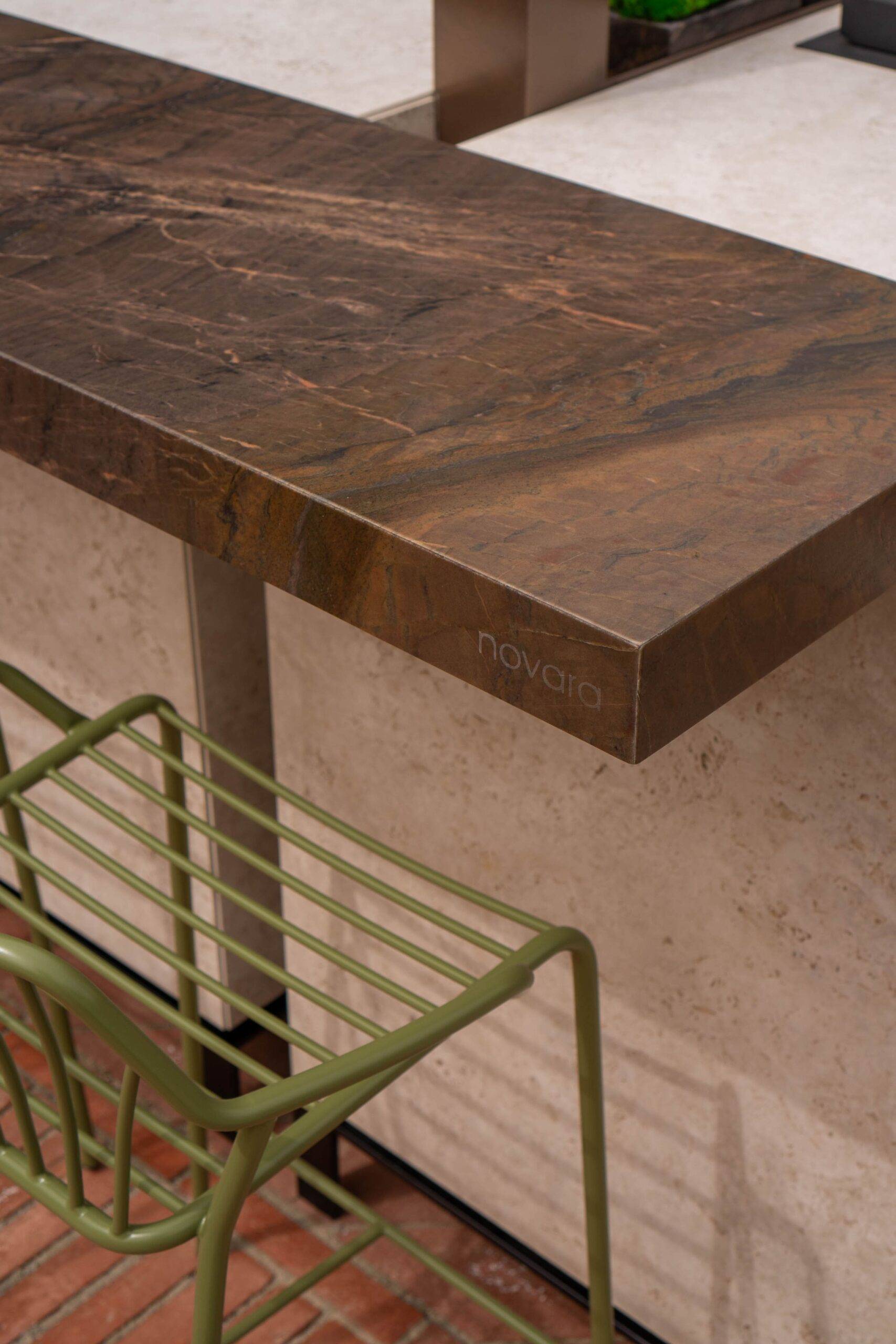 The collection is distinguished by its exclusive character: liquid metal finishes—including Copper, Gold, Bronze and Titanium—are paired with Dekton® by Cosentino surfaces in Sabbia and Grafite, creating a timeless and sophisticated aesthetic.