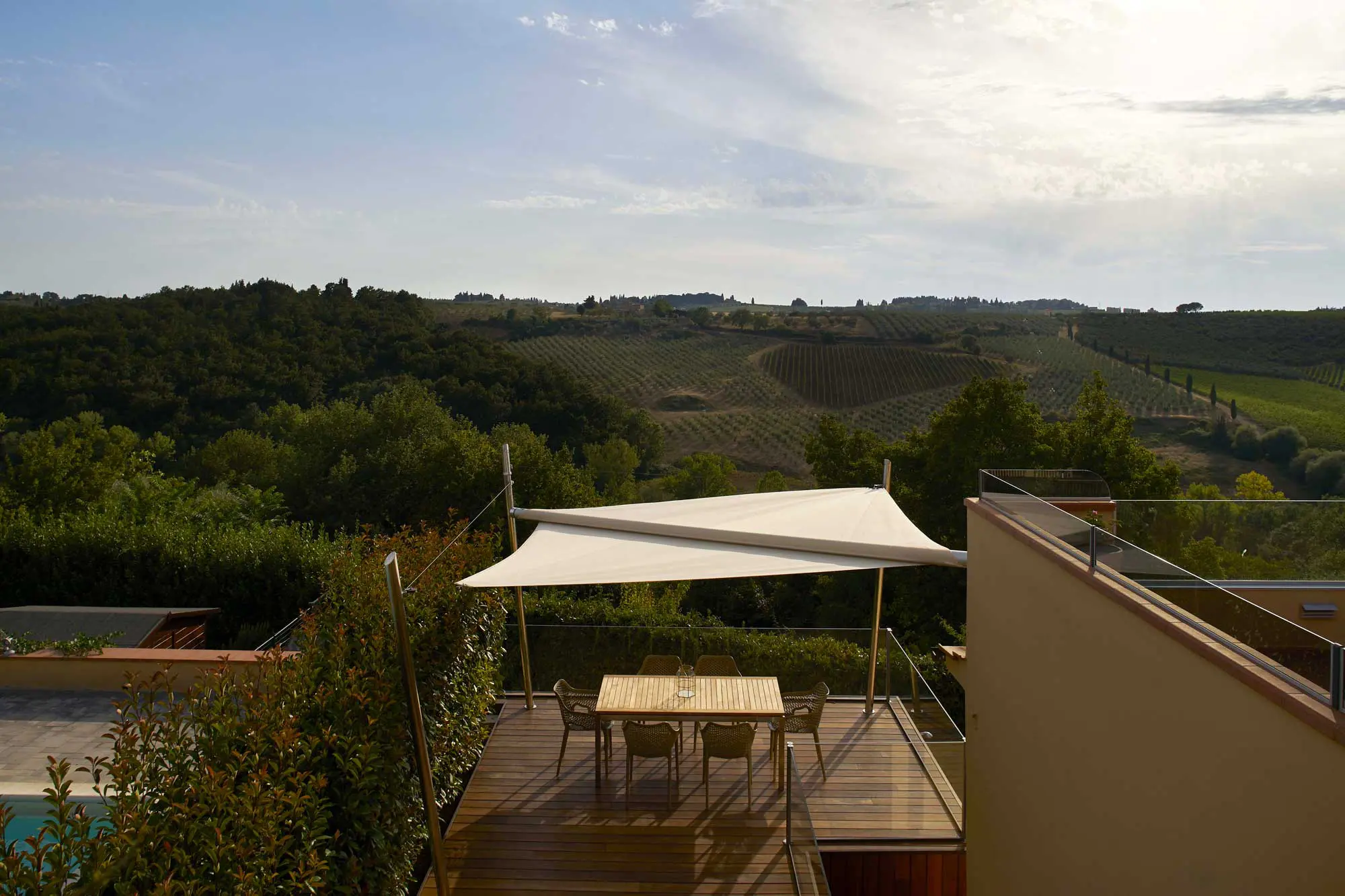 Versatility, elegance, and practicality, all in one architectural prototype with a single broken stainless steel support mast that allows for a 360-degree orientation of the sail thanks to its pedestal with bearings.