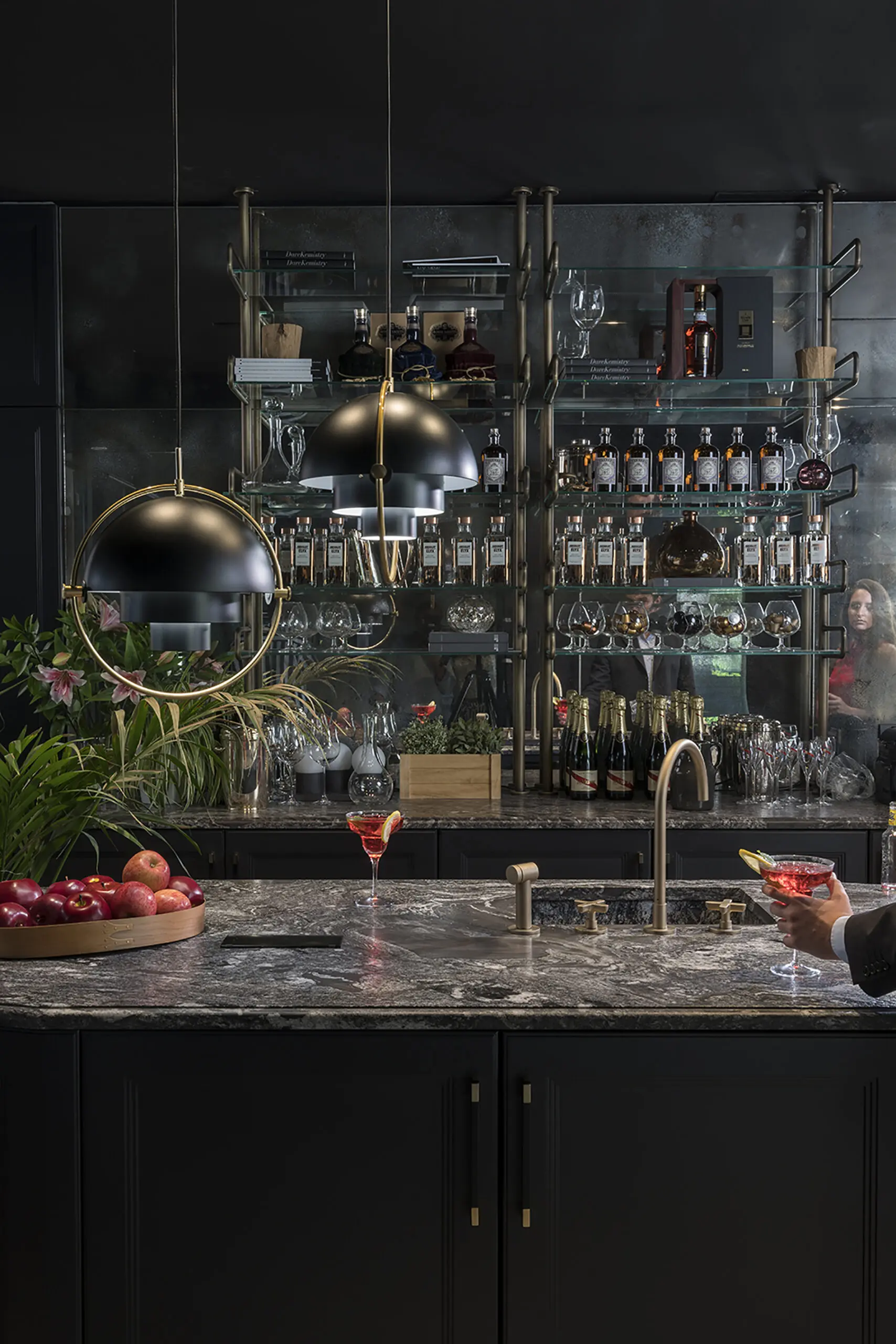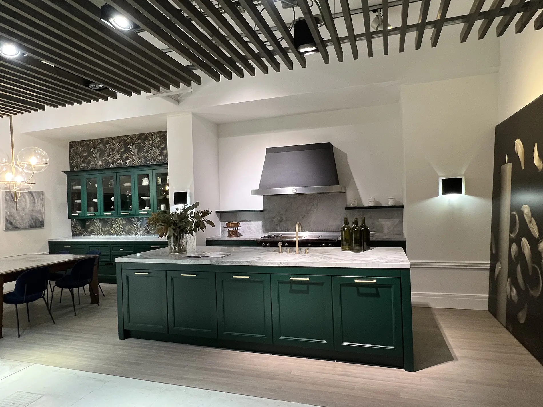 Para conseguir este estilo, hay que utilizar materiales robustos y elegantes, contrastando tonos lujosos de oro, bronce, plata y crema con azules, morados, negros y verdes. Utilice superficies de cristal o metal brillantes y muebles de calidad. El uso de materiales lujosos como las maderas oscuras, el cuero y el terciopelo refuerzan aún más esta imagen.